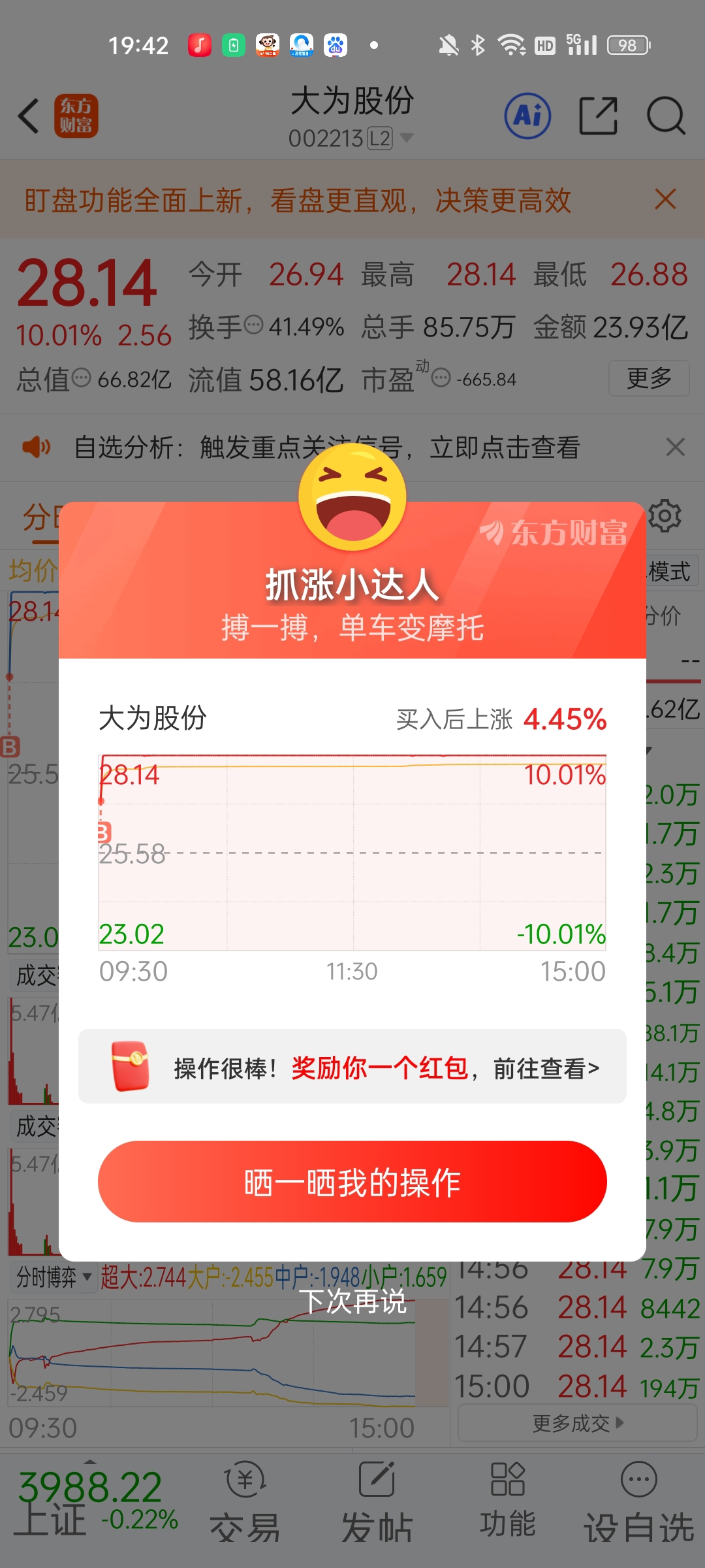 $大为股份(SZ002213)$ 为什么打这个第三板,因为首板封单占成比值强势,昨天又是一字涨停,今天打板也是有风险的。但是,谷市本身就是风险巨大的地方,与其被收割,不如胆大一些,说不定能收割别人