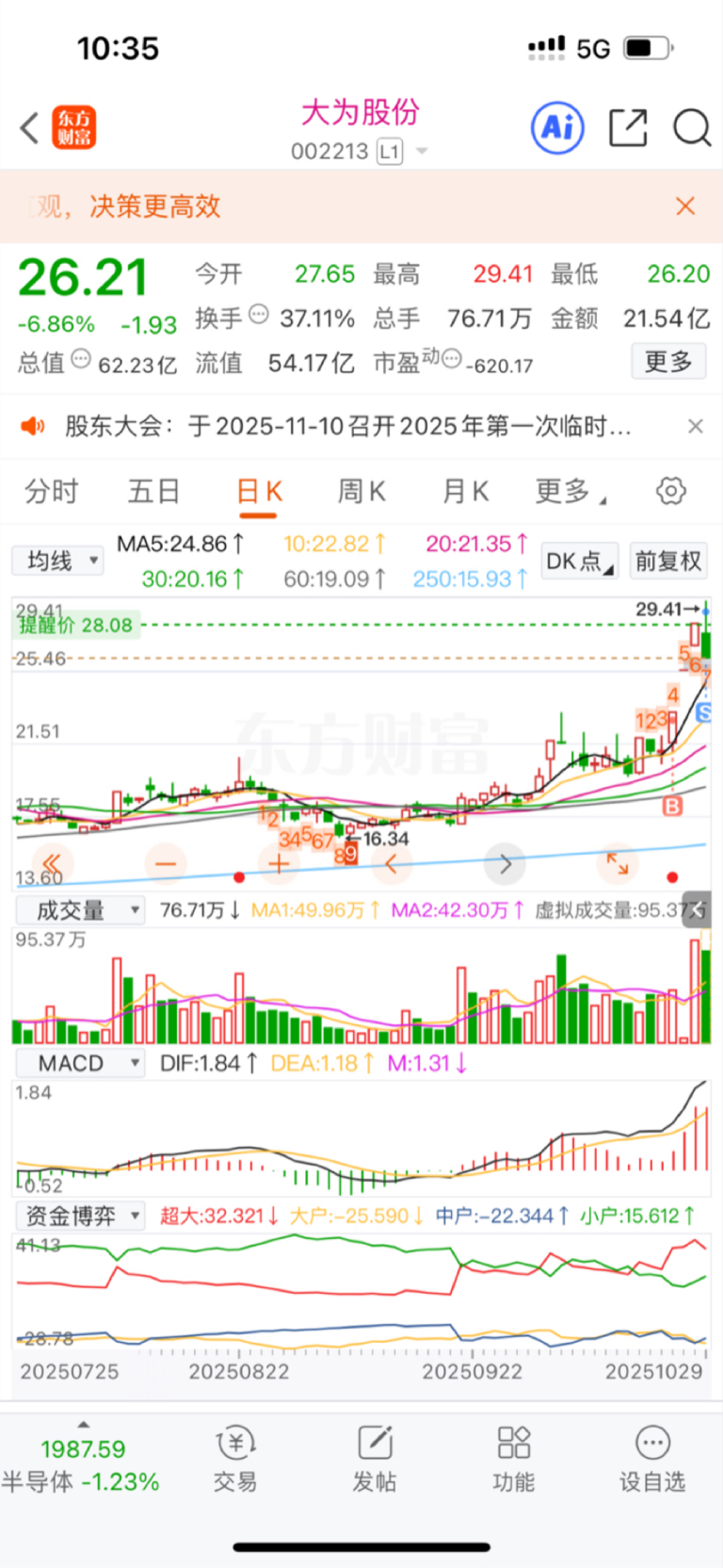 $大为股份(SZ002213)$ 88,开板冲高就跑。四天,25个点