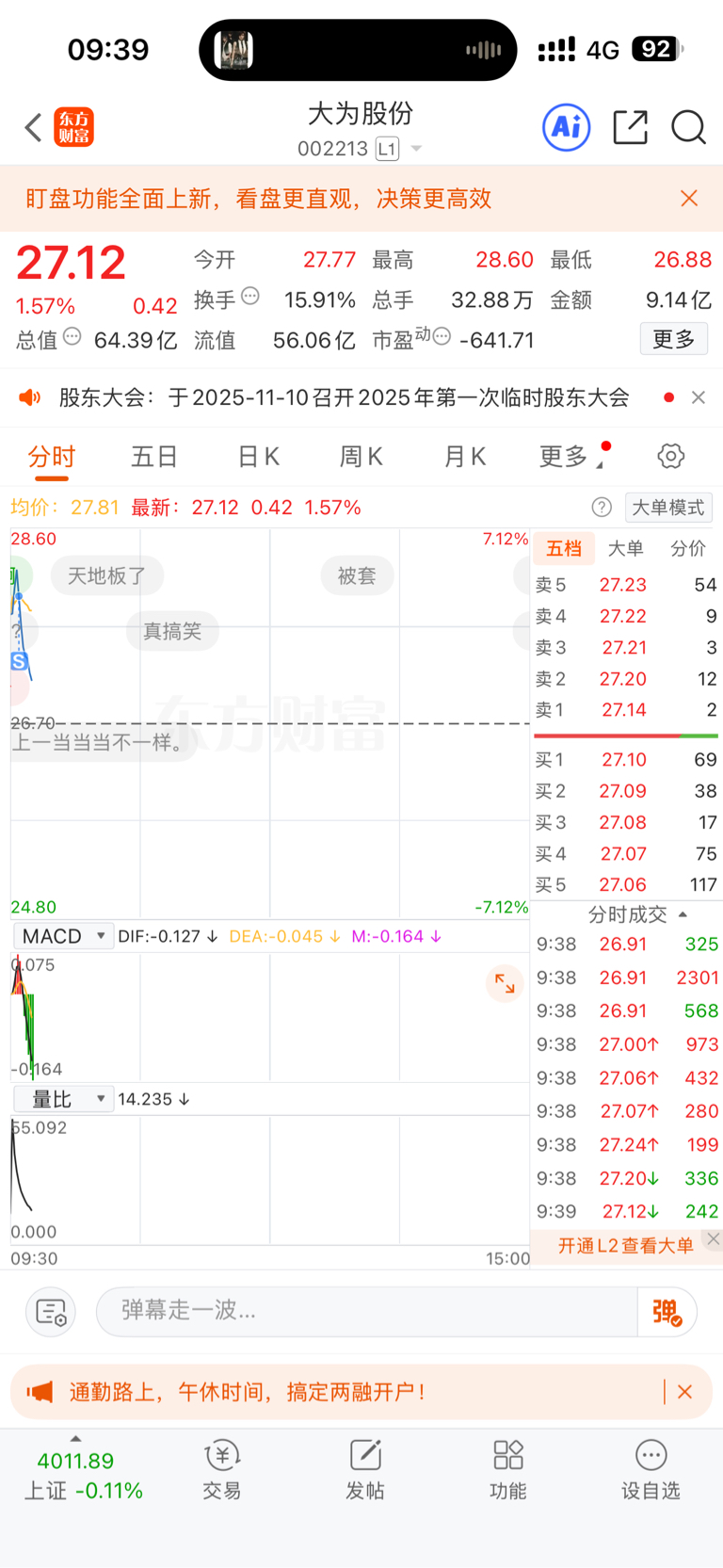 $大为股份(SZ002213)$ 昨天就是冲高跳水,今天也是长记性了