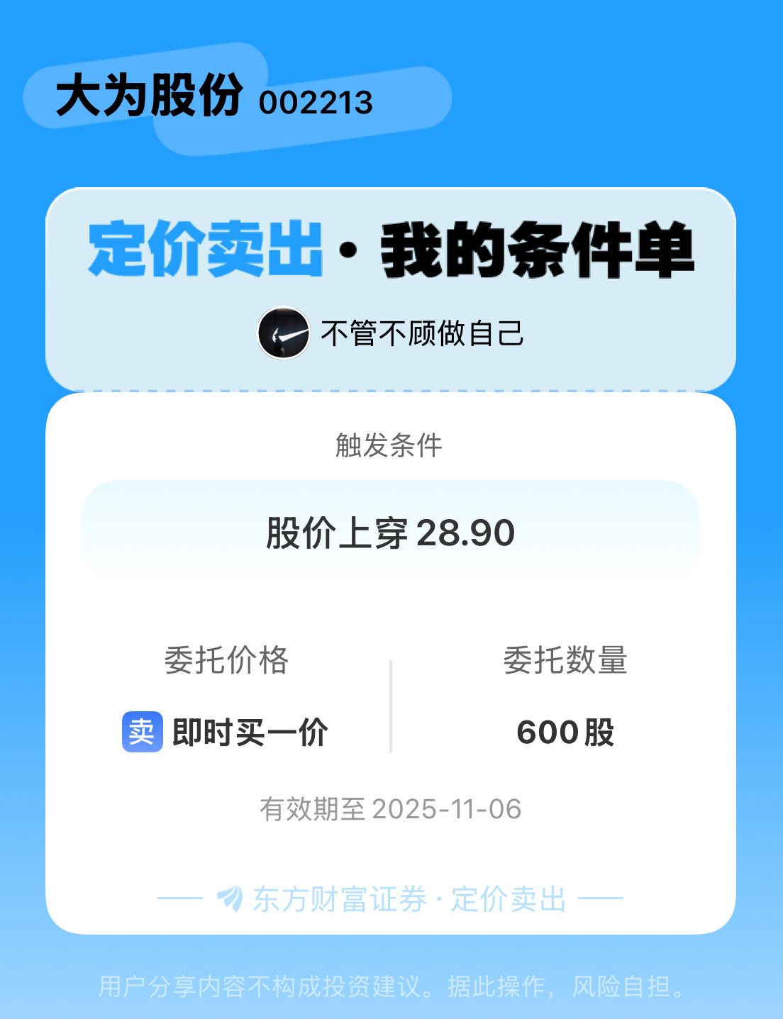 #条件单交流# #定价卖出晒单# 一位股神设置了一个定价卖出条件单,接下来就是见证奇迹的时刻~$大为股份(SZ002213)$
