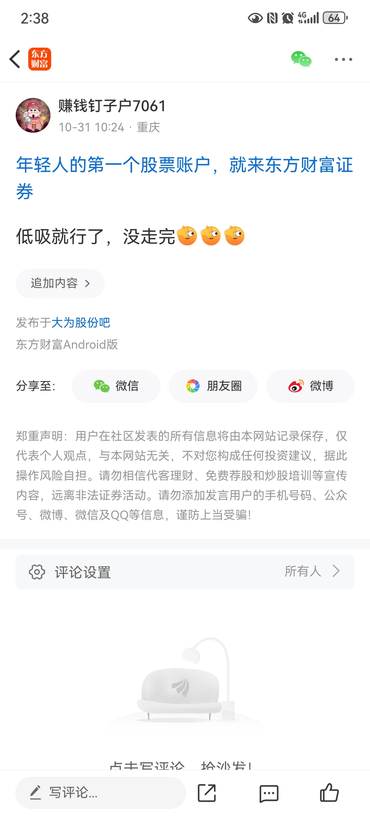温馨提示: 1.根据《证券法》规定,禁止编造、传播虚假信息或者误导性信息,扰乱证券市场;2.用户在本社区发表的所有资料、言论等仅代表个人观点,与本网站立场无关,不对您构成任何投资建议。用户应基于自己的独立判断,自行决定证券投资并承担相应风险。《东方财富社区管理规定》