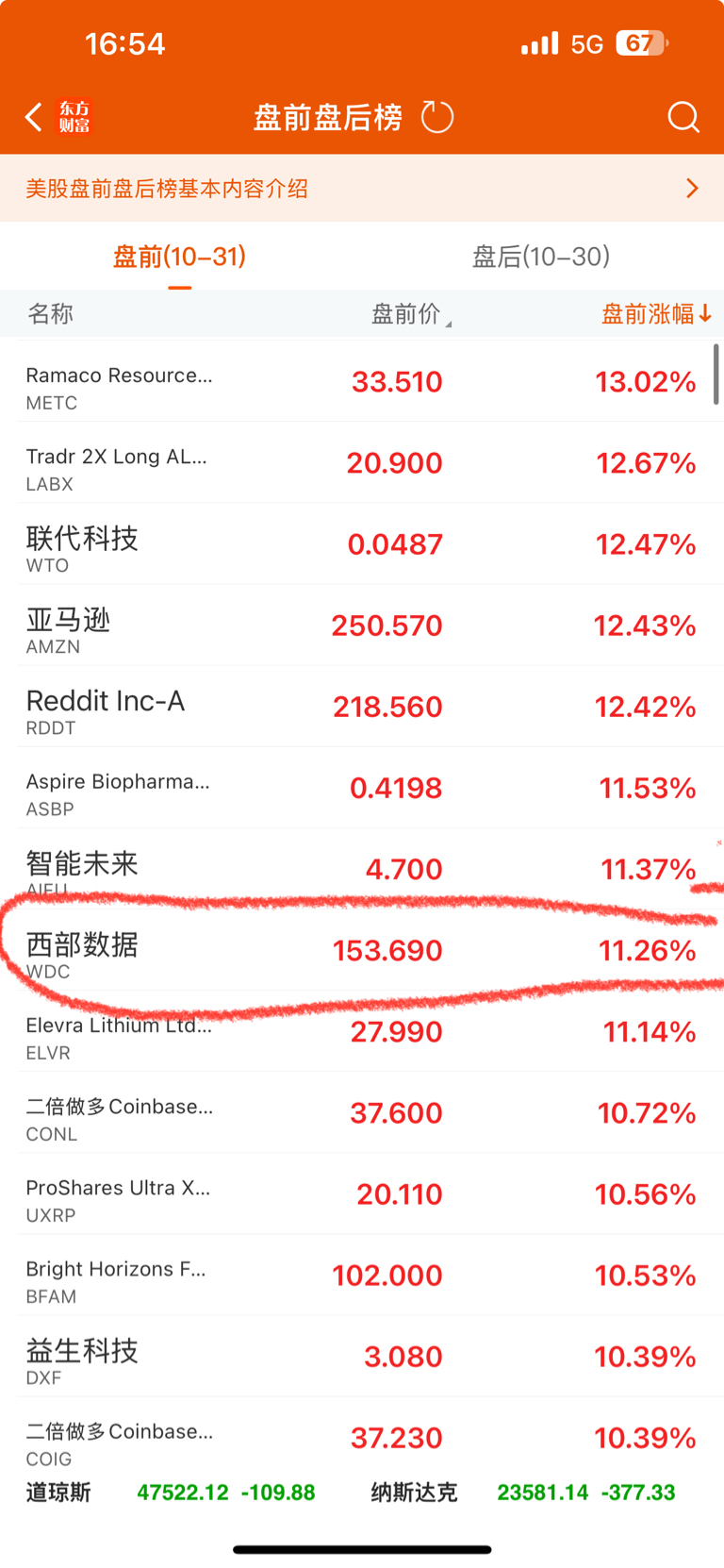 $大为股份(SZ002213)$ 西部数据盘前暴涨