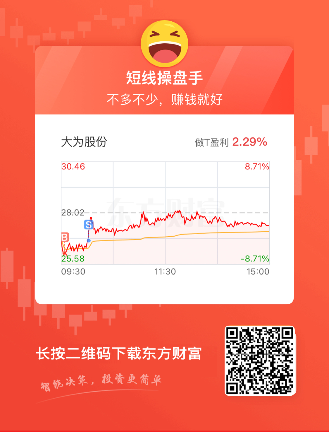 大为的股性很强,今天在低开6个多点加仓T出去,挣钱了
