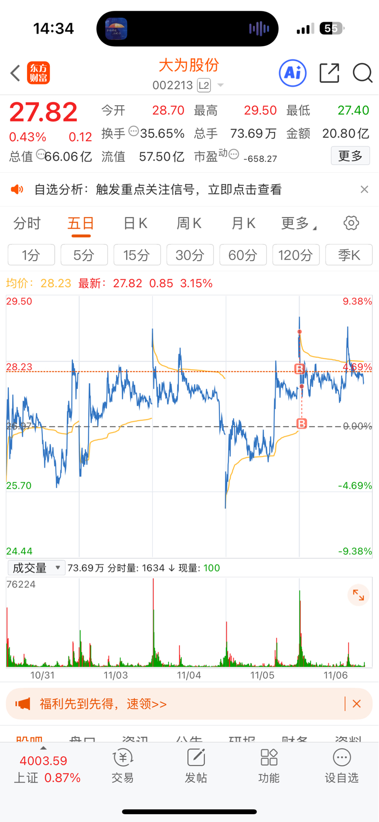 $大为股份(SZ002213)$ 低开高走,高开必低走。这股大跌再买