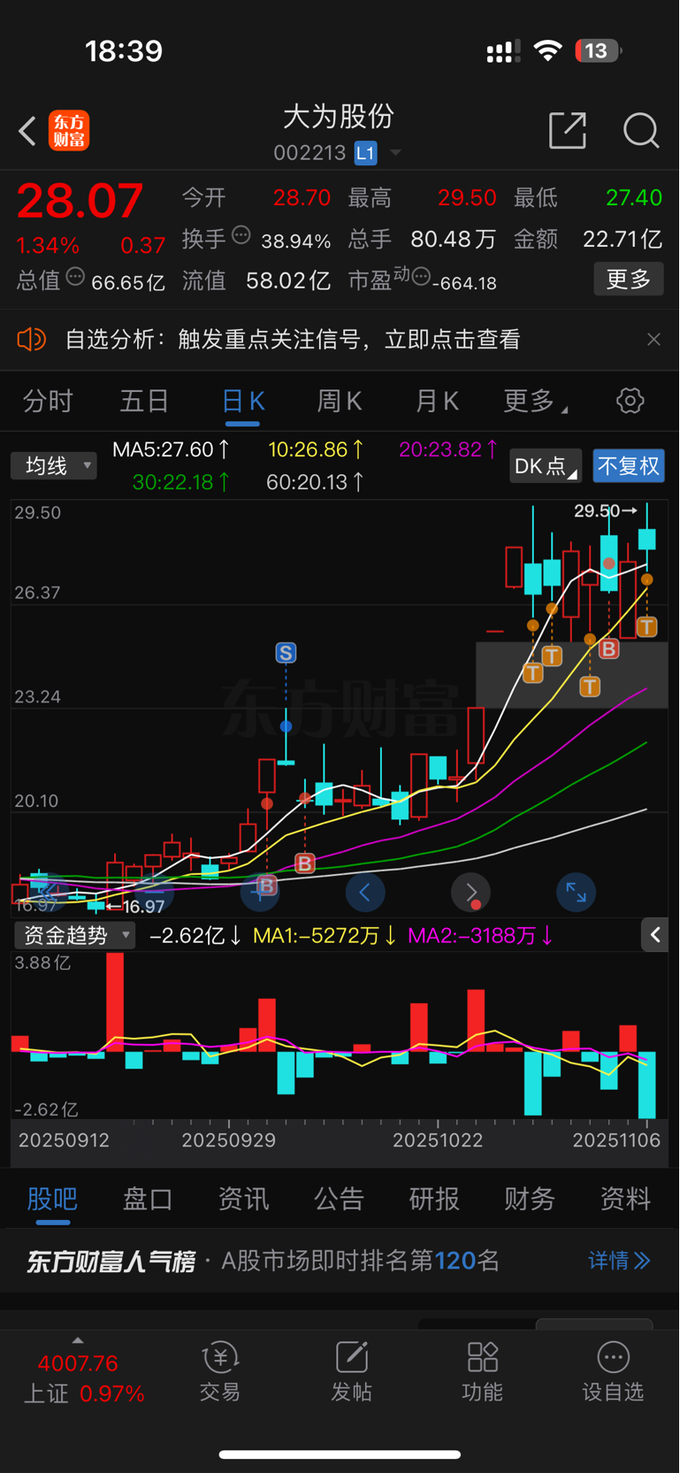 $大为股份(SZ002213)$ 追长杀跌不可取,明天开始不T了