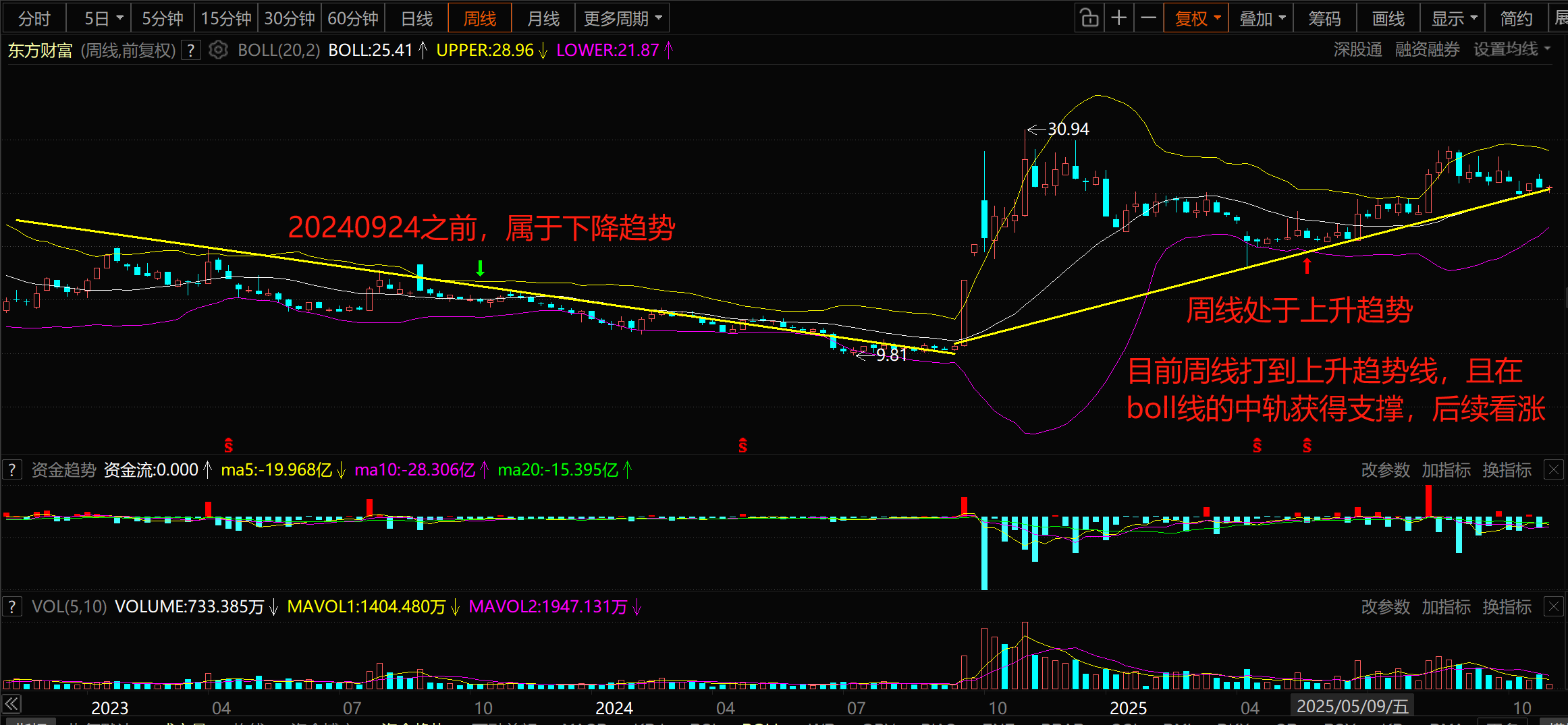 东财:我们要相信趋势的力量,一单趋势形成,跟随趋势才是最理智的选择。东财周线进入了上升趋势,目前调整到布林线中轨已经四周止跌企稳,那么后面就只有向上轨奔赴这一条路。今天日线上穿五日线,新的波段行情正在路上!