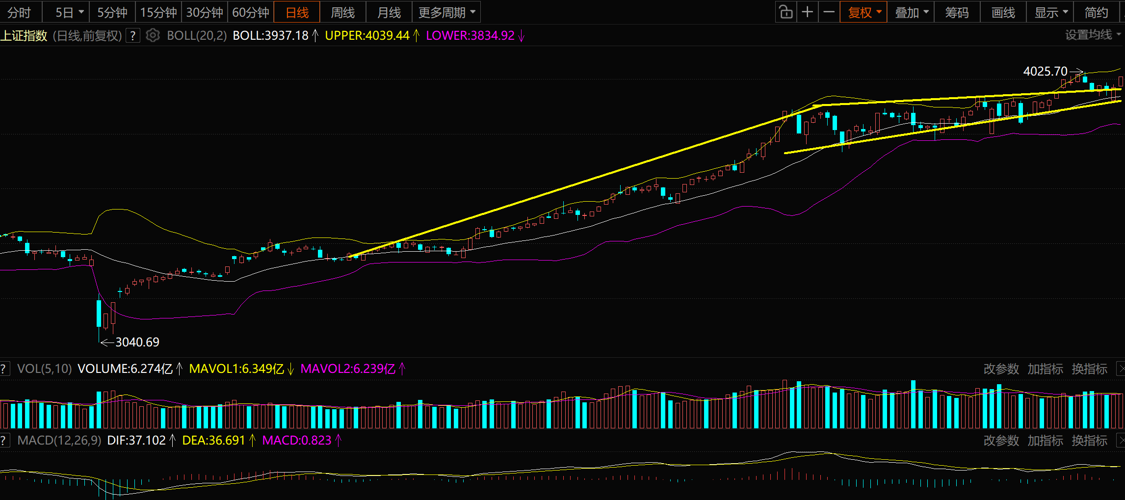 大盘:今日高开高走,温和放量上穿五日线,预示着发展新的逼空行情有启动的迹象。上证指数的调整仅限于打到布林线的中轨而后反转向上,目前看第一目标就是突破4026,如果量能配合,将会启动新的上涨周期,必然要达到4100及以上。最高看到4500左右,才有阶段性的调仓修正条件,否则主力不具备出货条件。这期间,也许券商板块只会用几天乃至一两个月的时间涨完一年的涨幅,因此要随时做好重仓的准备,防止被偷袭。