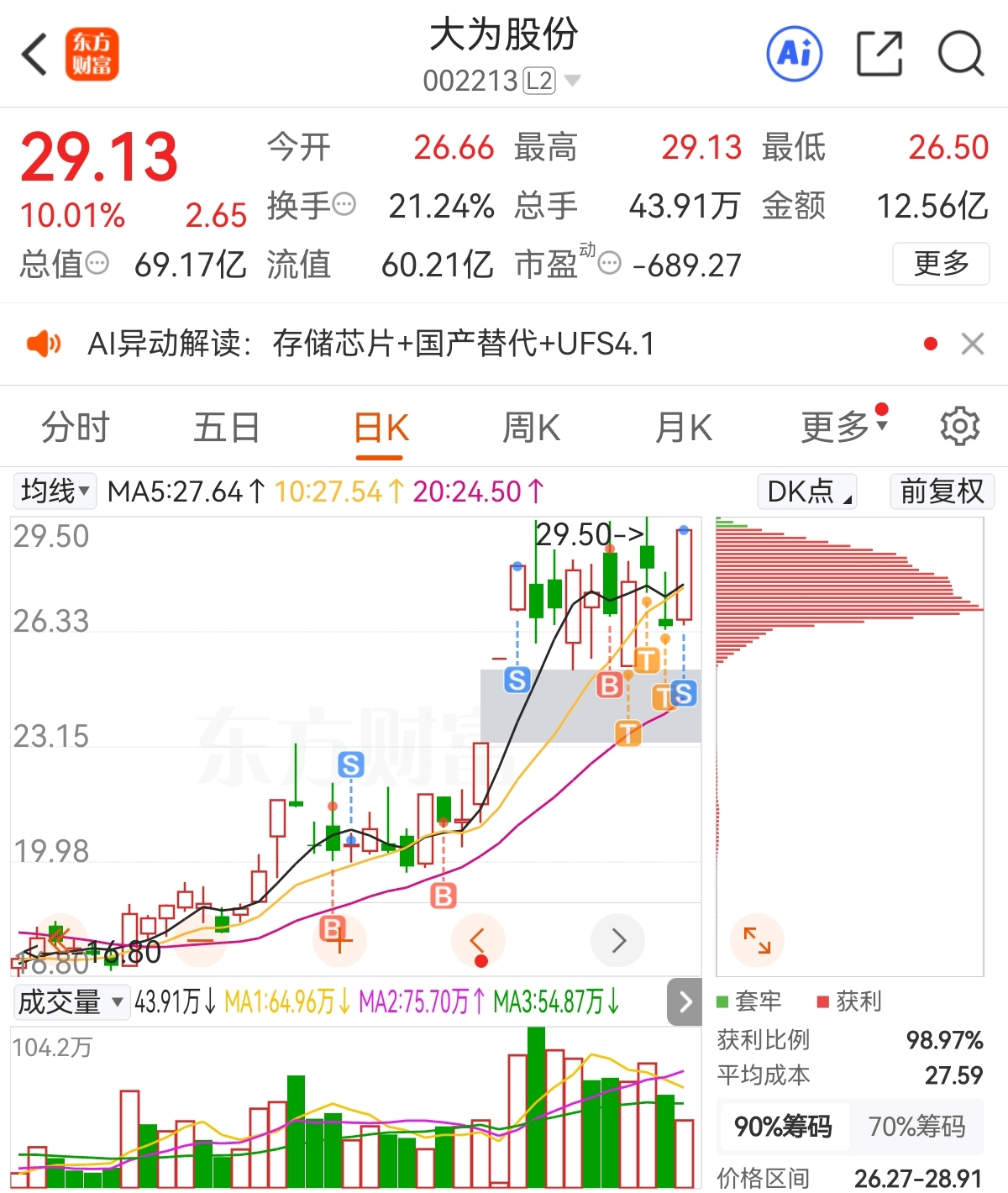 $大为股份(SZ002213)$ 虽然知道大为必走第二波,但是前两天的抄底筹码还没洗出去,预期是炸板清理一下,盘中炸板符合预期,涨停清仓准备6%-8%接回来,结果秒回封,明天要么直接加速一字,要么就会全天横在-3%左右清理浮筹,明天验证
