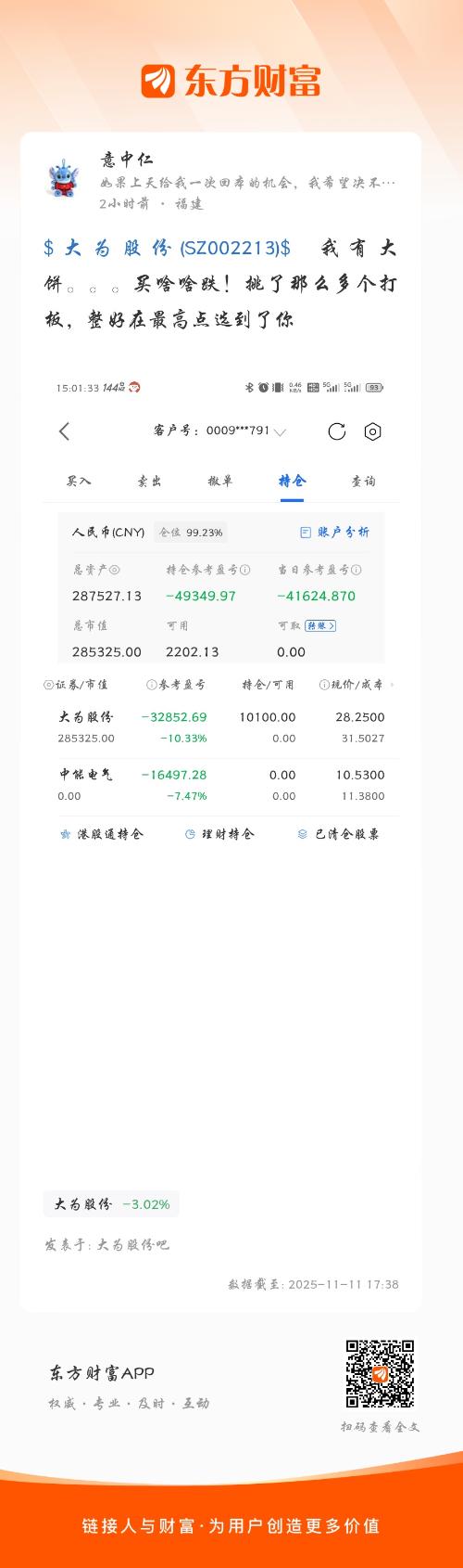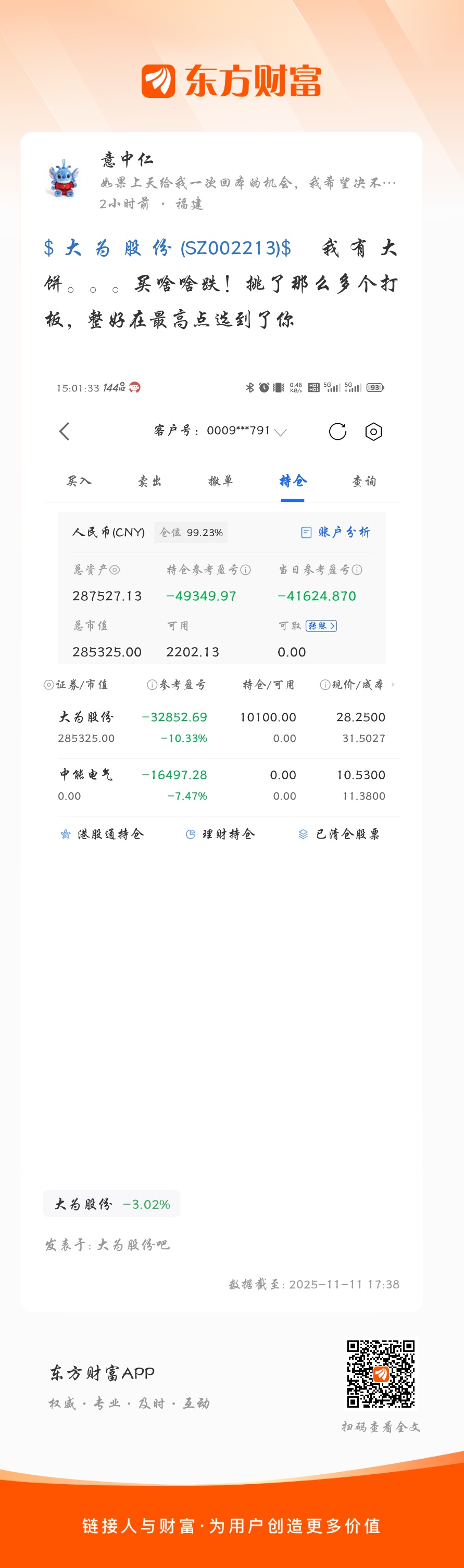 $大为股份(SZ002213)$  我有大饼。。。买啥啥跌!挑了那么多个打板,整好在最高点选到了你