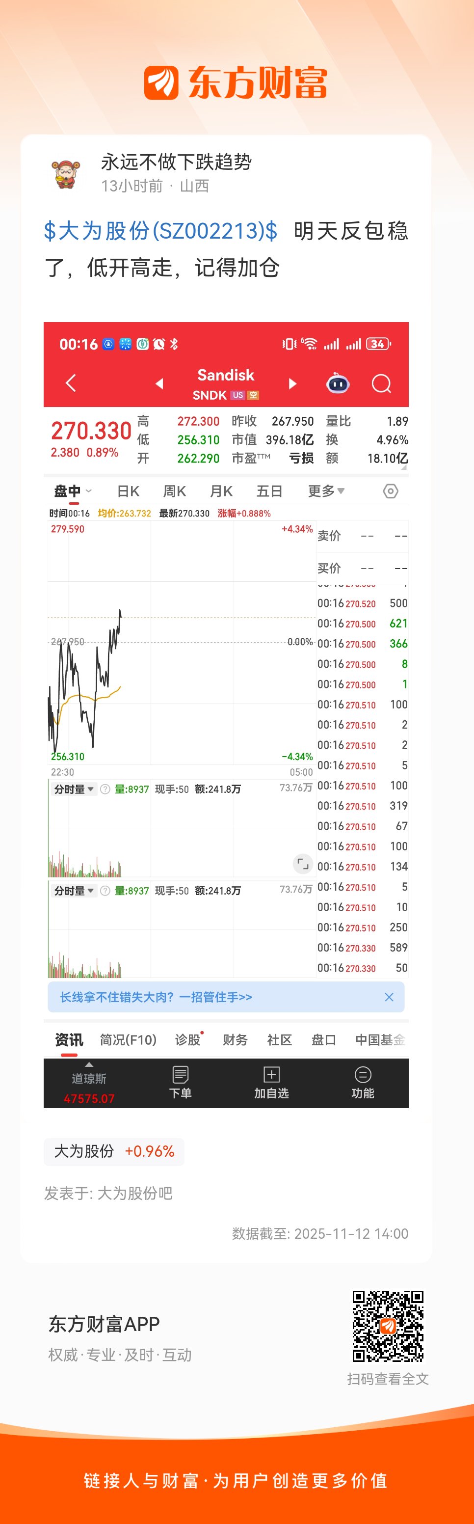 $大为股份(SZ002213)$  明天反包稳了,低开高走,记得加仓