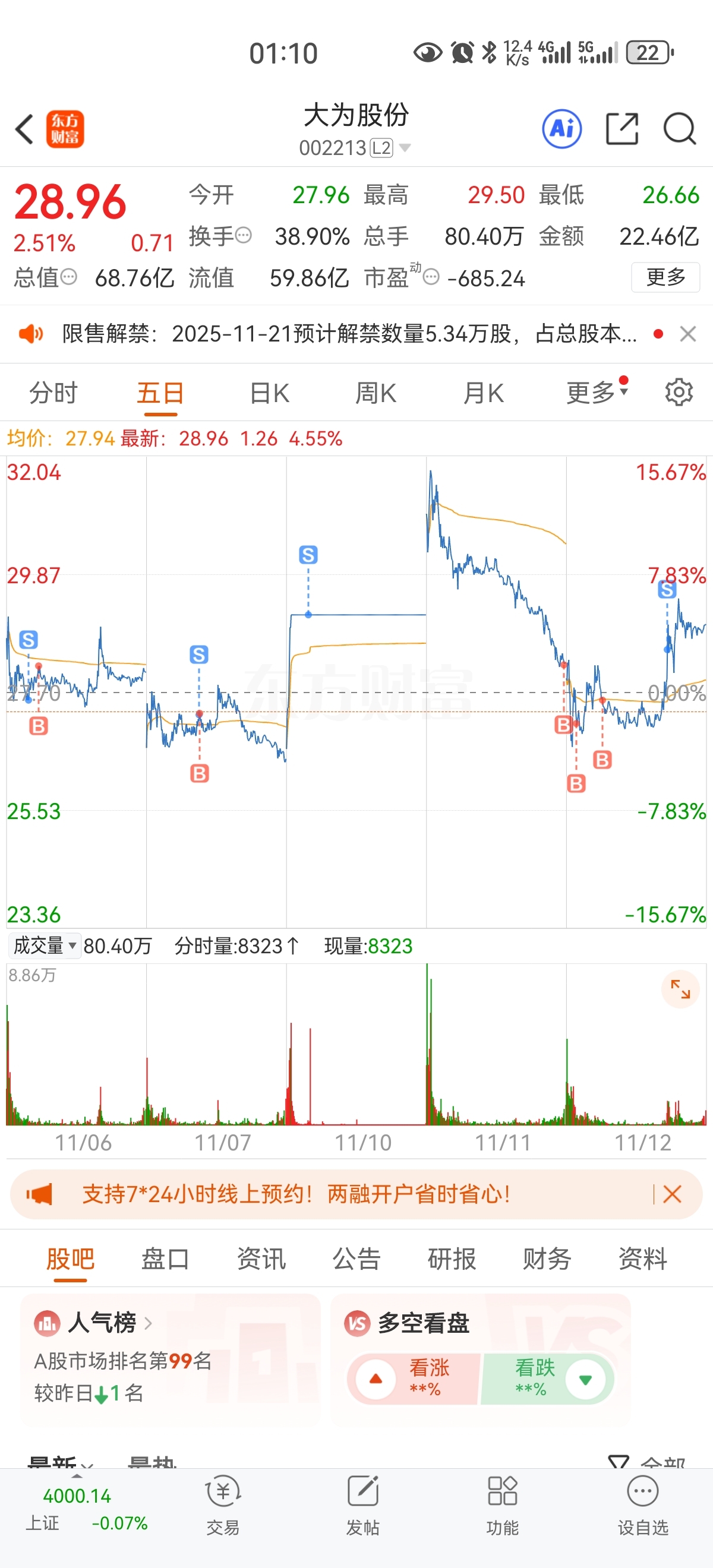 $大为股份(SZ002213)$ 昨天套了那么多人,如果今天全天横盘在水下,明天还可能会板,今天已经拉起来了,明天板的可能性不大,明天水下再磨一下,周五板