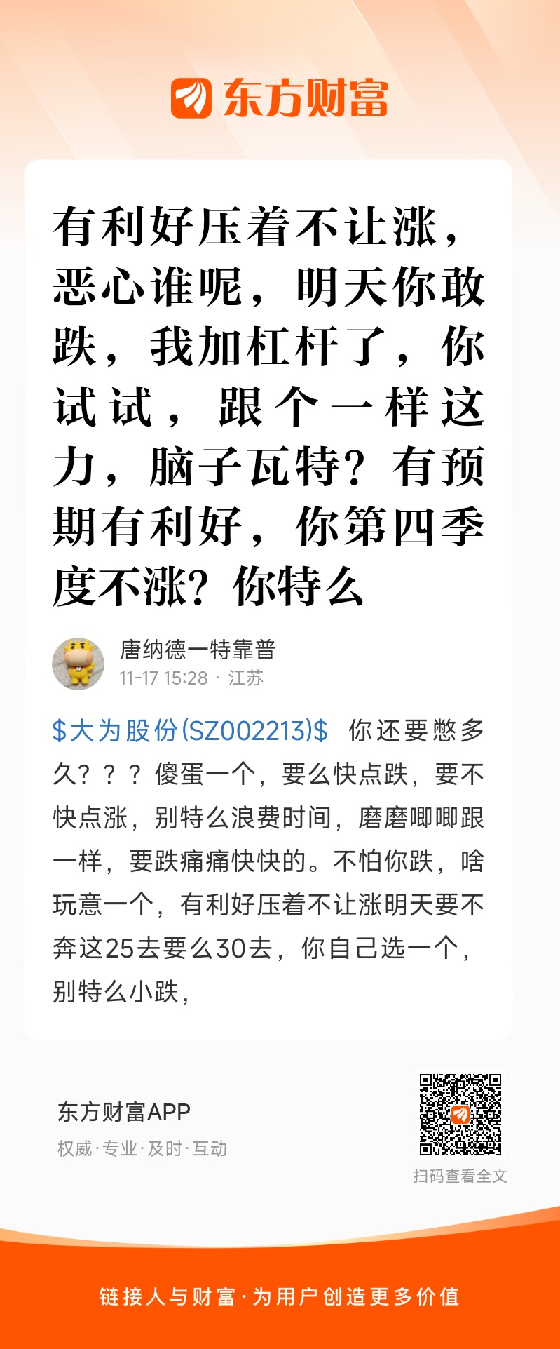 $大为股份(SZ002213)$ 你还要憋多久???傻蛋一个,要么快点跌,要不快点涨,别特么浪费时间,磨磨唧唧跟一样,要跌痛痛快快的。不怕你跌,啥玩意一个,有利好压着不让涨明天要不奔这25去要么30去,你自己选一个,别特么小跌,