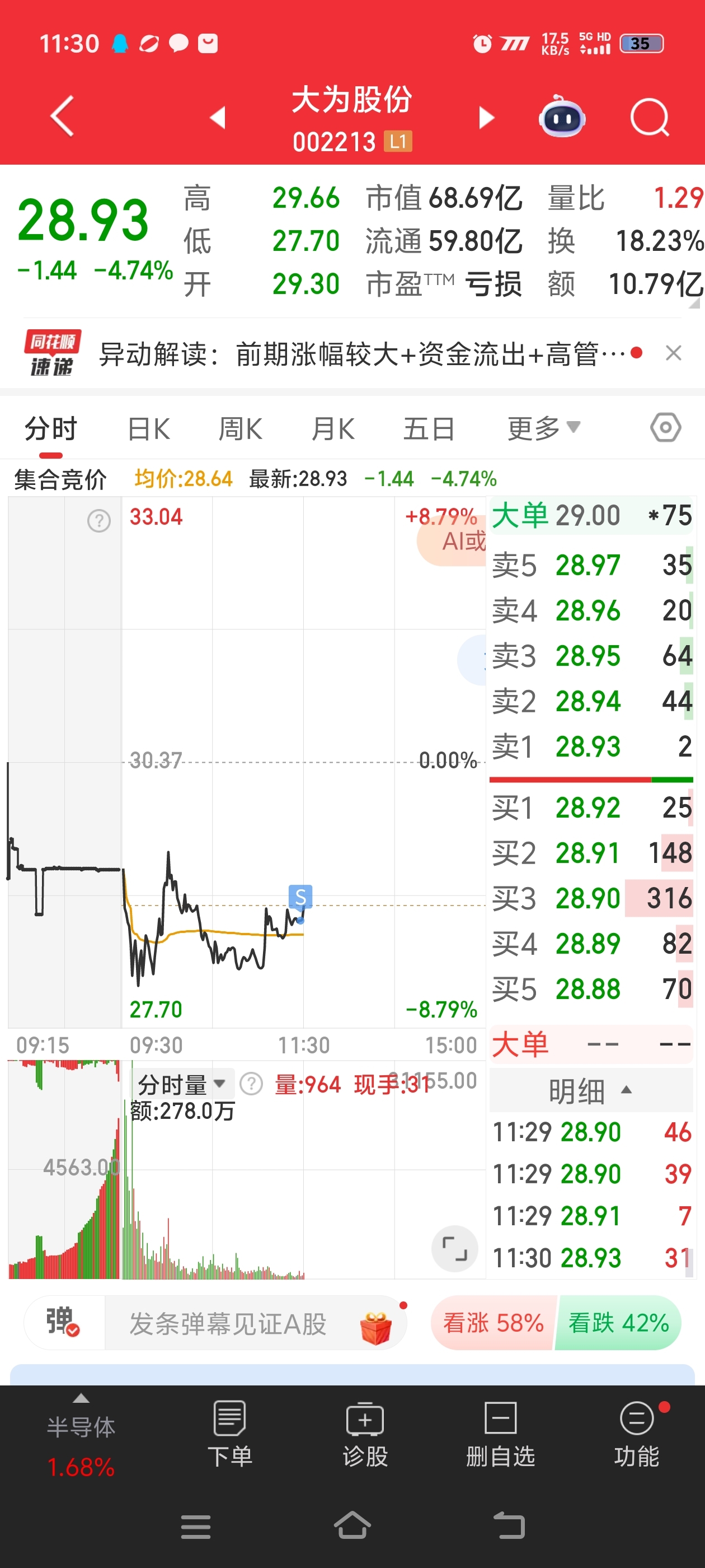 $大为股份(SZ002213)$ 28.77出了就拉,亏了一毛钱,昨天抄底也吃不到肉,认输