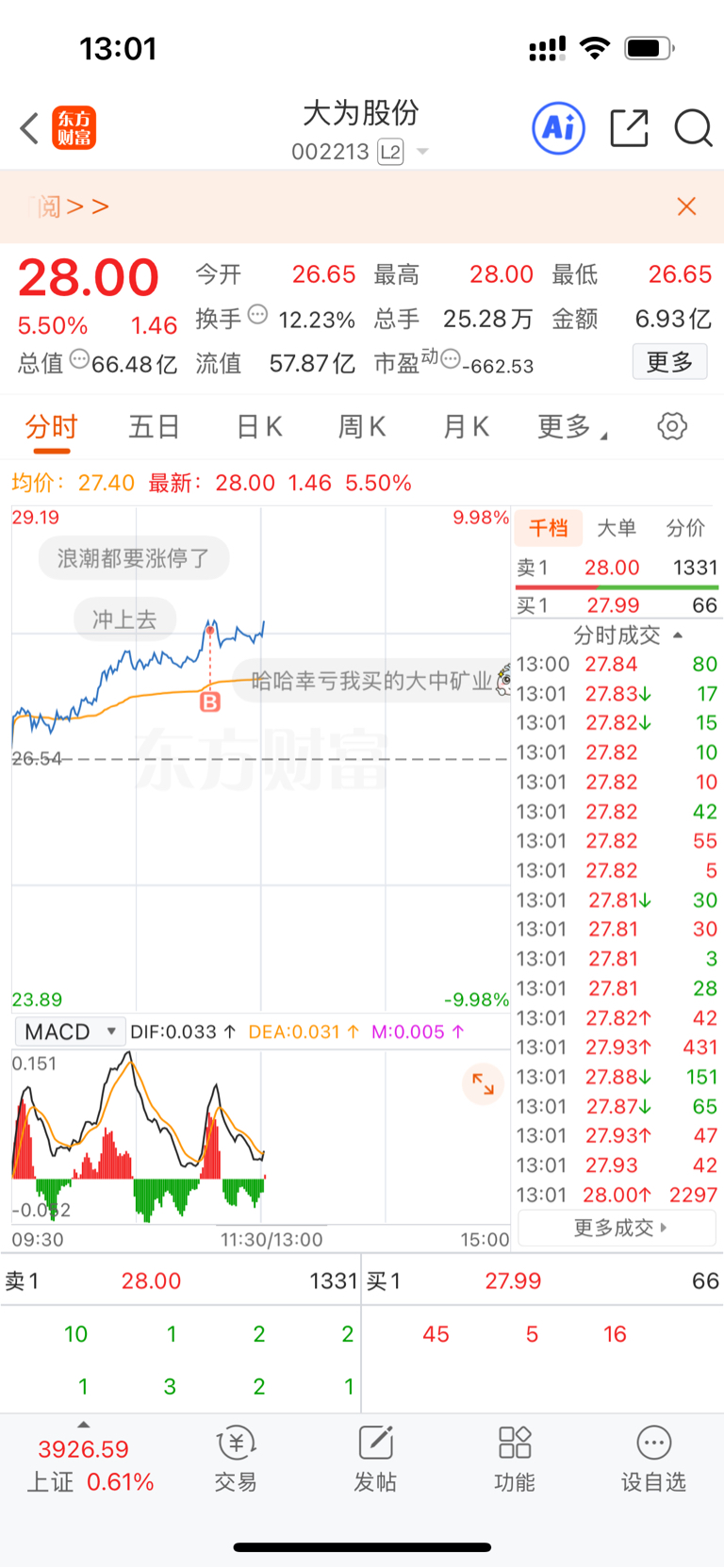 $大为股份(SZ002213)$ 看K线图今天应该是板了