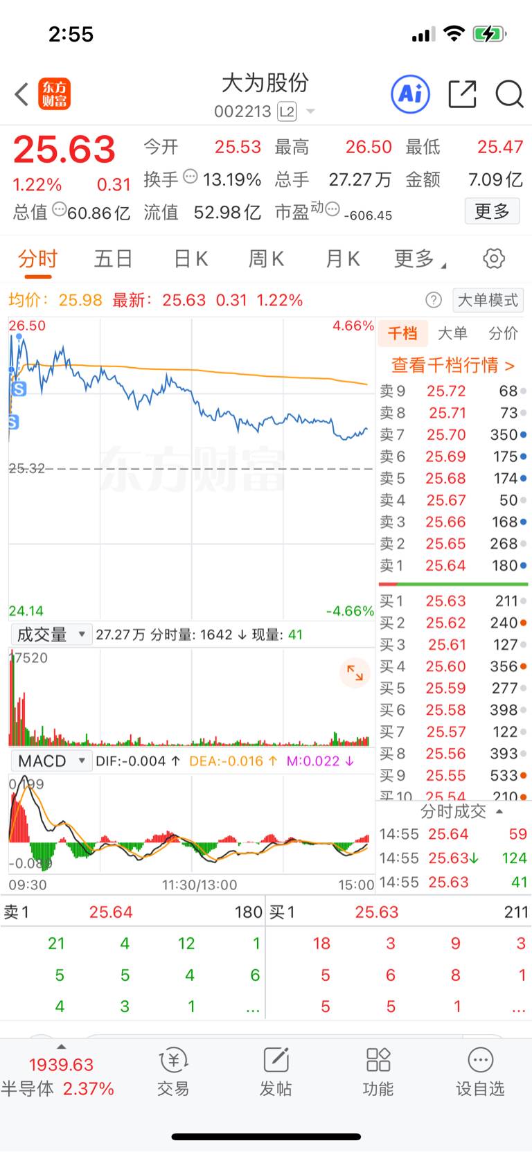 $大为股份(SZ002213)$ 周五尾盘进的,早盘冲高跑了
