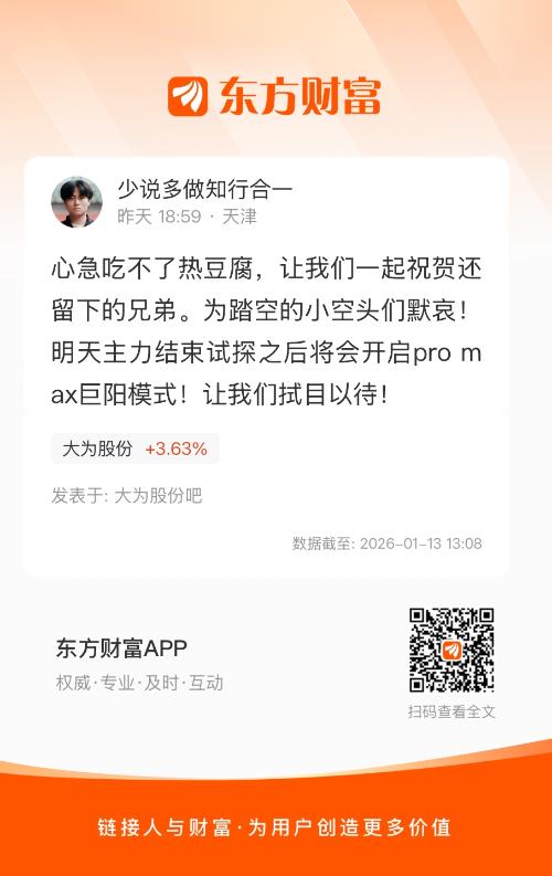 心急吃不了热豆腐,让我们一起祝贺还留下的兄弟。为踏空的小空头们默哀!明天主力结束试探之后将会开启pro max巨阳模式!让我们拭目以待!