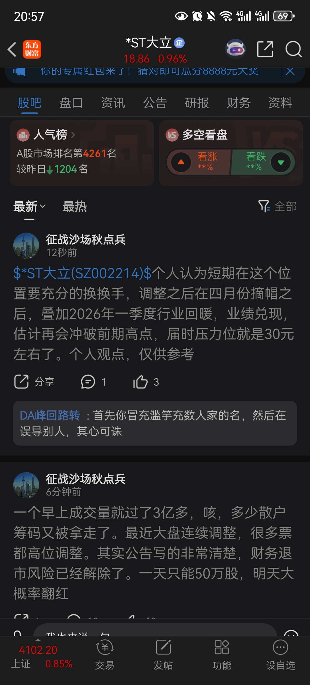 温馨提示: 1.根据《证券法》规定,禁止编造、传播虚假信息或者误导性信息,扰乱证券市场;2.用户在本社区发表的所有资料、言论等仅代表个人观点,与本网站立场无关,不对您构成任何投资建议。用户应基于自己的独立判断,自行决定证券投资并承担相应风险。《东方财富社区管理规定》