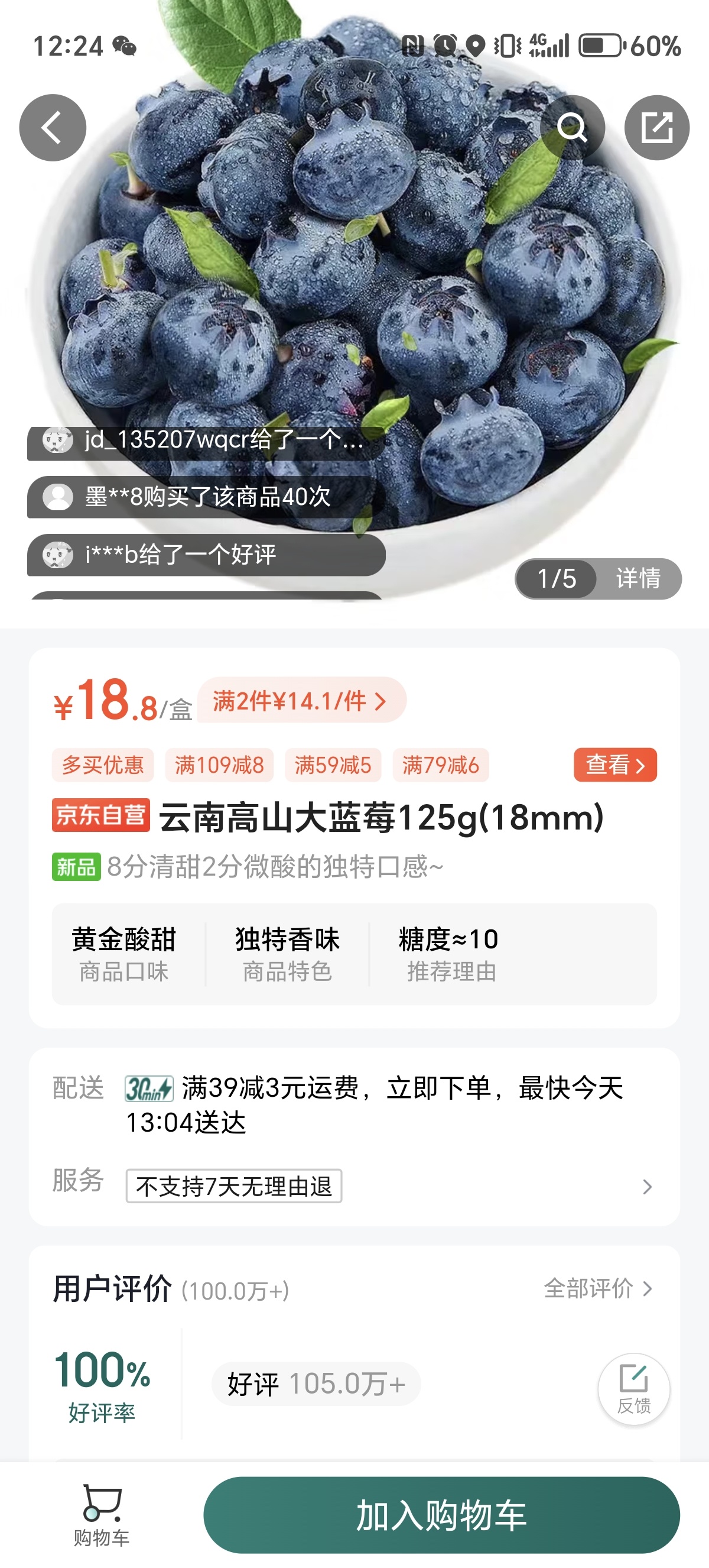 七鲜线上: 自采云南蓝莓18mm(促销第二件五折),112元,不促销180元