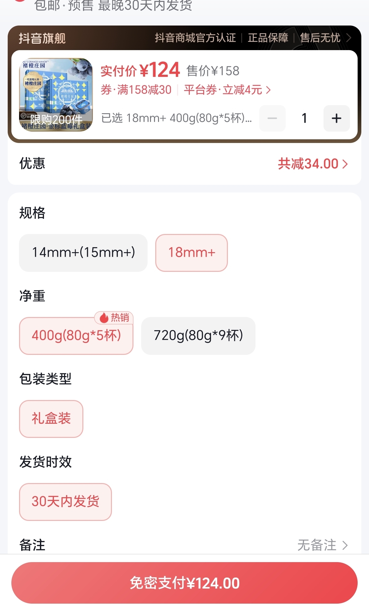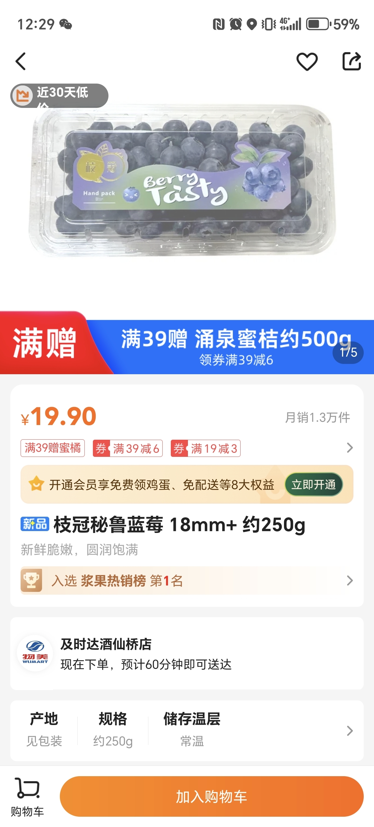 山姆线上:进口秘鲁蓝莓18mm,98元