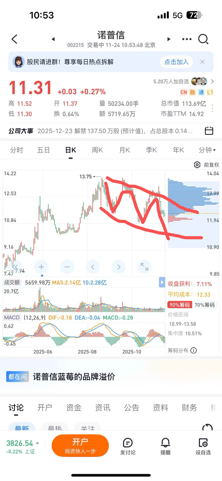 $诺 普 信(SZ002215)$ 标准的下跌通道,一浪比一浪低,上轮反弹跑进来的2亿融资盘,韭菜们还以为主力买的,结果发现是中户大户们买的,融资余额不降到7.5亿以下不会止跌的