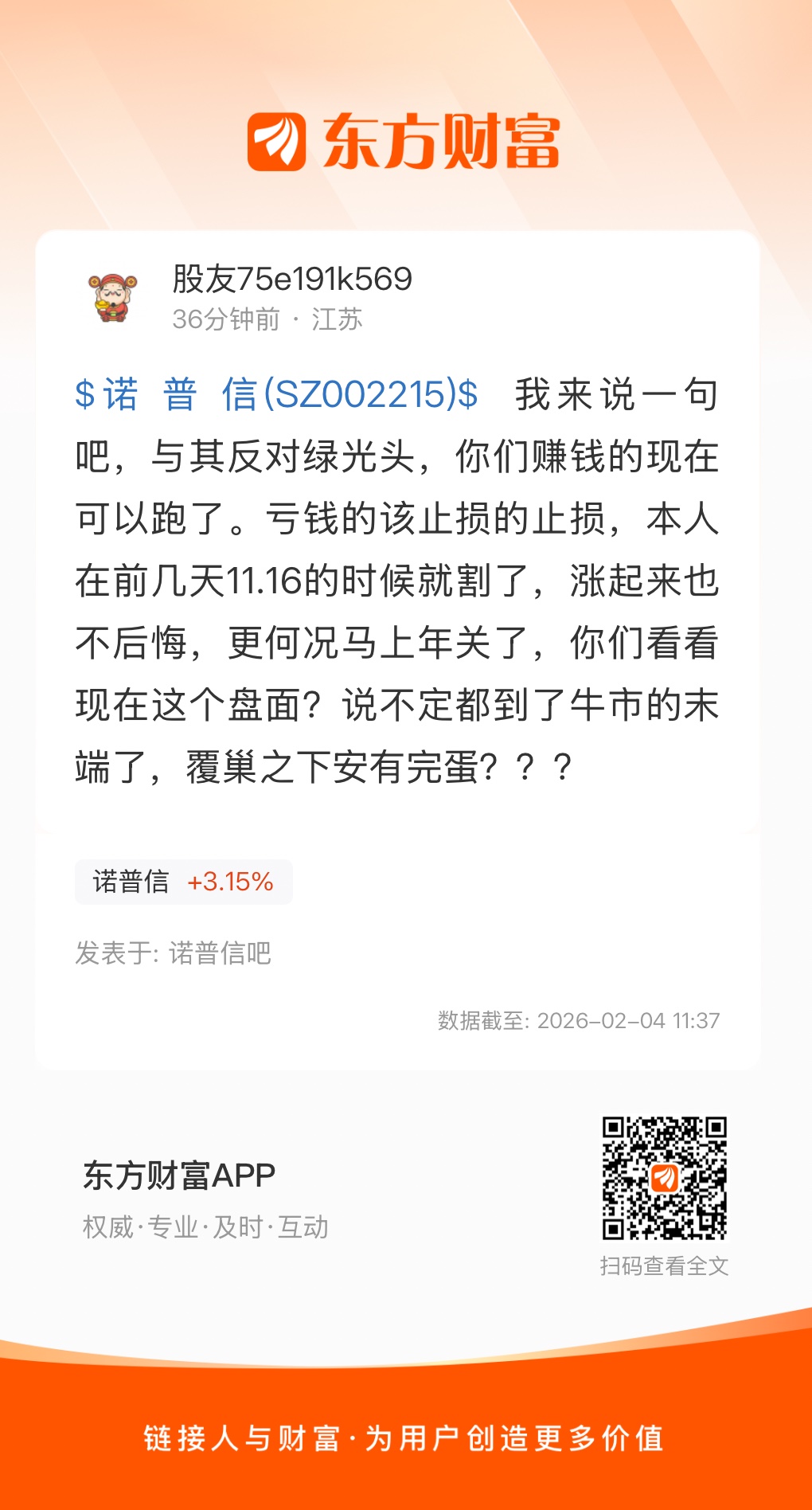 $诺 普 信(SZ002215)$ 我来说一句吧,与其反对绿光头,你们赚钱的现在可以跑了。亏钱的该止损的止损,本人在前几天11.16的时候就割了,涨起来也不后悔,更何况马上年关了,你们看看现在这个盘面?说不定都到了牛市的末端了,覆巢之下安有完蛋???