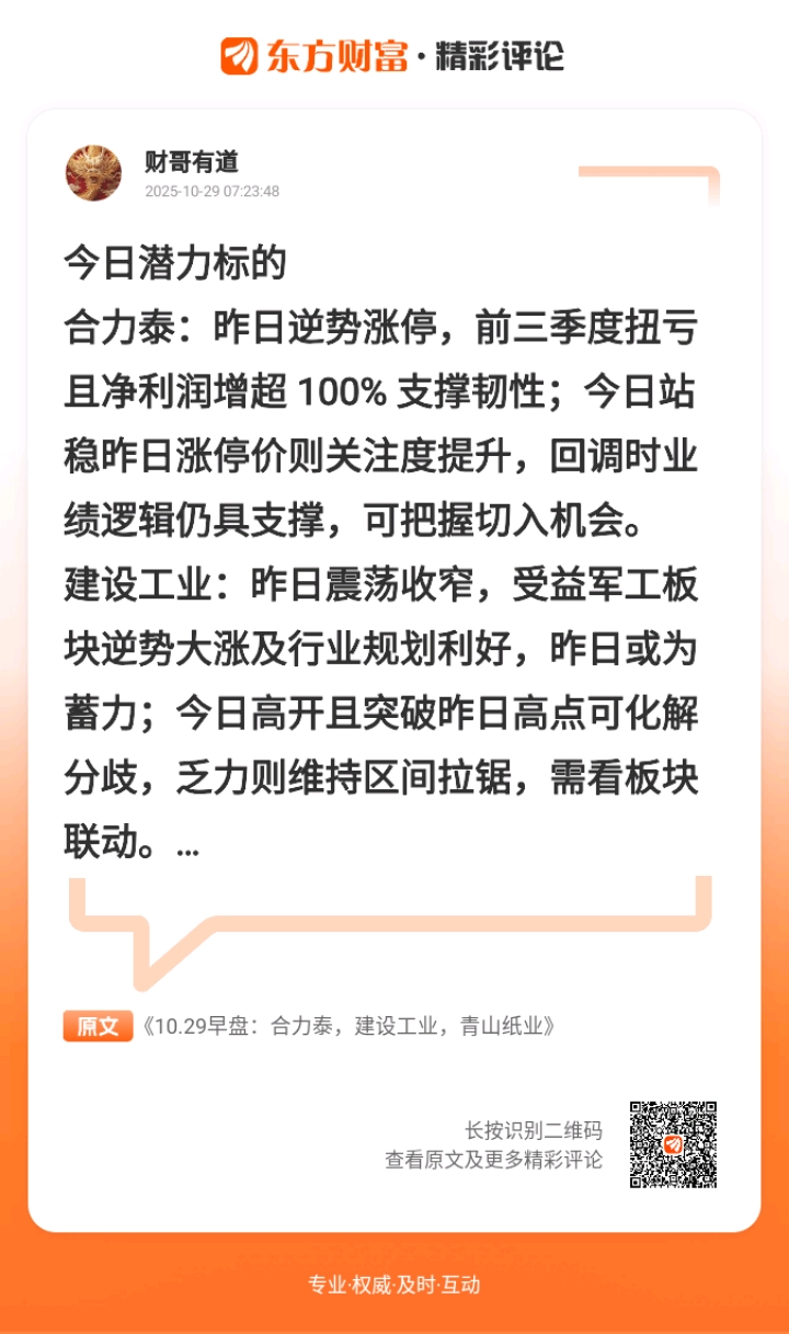 早上好//@财哥有道 :今日潜力标的$合力泰(SZ002217)$:昨日逆势涨停,前三季度扭亏且净利润增超 100% 支撑韧性;今日站稳昨日涨停价则关注度提升,回调时业绩逻辑仍具支撑,可把握切入机会。$建设工业(SZ002265)$:昨日震荡收窄,受益军工板块逆势大涨及行业规划利好,昨日或为蓄力;今日高开且突破昨日高点可化解分歧,乏力则维持区间拉锯,需看板块联动。$青山纸业(SH600103)$:昨日震荡收涨符合多头趋势,新型林浆纸布局托底基本面;需注意价升量缩、5 日资金流出风险,短期支撑 3.58 元,今日若保上涨动能有望突破,回调空间有限。二、指数展望昨日低开反弹至 4000 点上方,量缩显关键点位观望情绪,午后回落契合连续上涨后谨慎态度(与突破 3900 点特征相似);向上趋势未改,今日大概率震荡调整,待量能与情绪共振后,有望再冲 4000 点。三、盘面与板块预判昨日冲高回落但向好趋势不变,核心板块为今日奠基:福建本地股凭政策持续强势,军工抗跌且基本面扎实;今日情绪料回暖、量能稳增,福建、军工领衔,影视院线、CPO 等轮动,赚钱效应温和释放,延续稳健态势。四、持有标的复盘赛力斯:昨日低开探 157.09 元后冲高 160.50 元,终微跌;今日 5/10 日均线黏合,站稳 159 元看估值溢价空间,跌破 157 元或深踩,持仓观察。卧龙电驱:昨日午后震荡攀升显弱转强,承接有力;今日续强或蓄力突破,锁仓。凯美特气:昨日冲高回落收绿,光刻气认证、订单增长等利好仍在;今日守支撑且借半导体材料热度或修复,否则震荡,持续观察。万向钱潮:昨日震荡上行显承接力,三季报增、海外储能订单及筹码集中支撑;今日站稳昨日高点可化解分歧续涨,持仓看多。