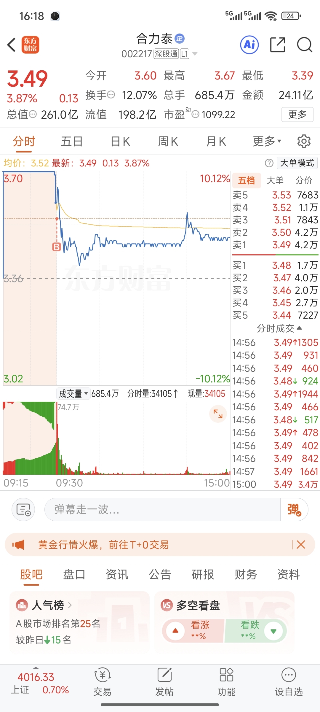 $合力泰(SZ002217)$ 早盘要是板上去我这个虚空S就可以吹牛了,可惜啊,明天不知道能不能全身而退。