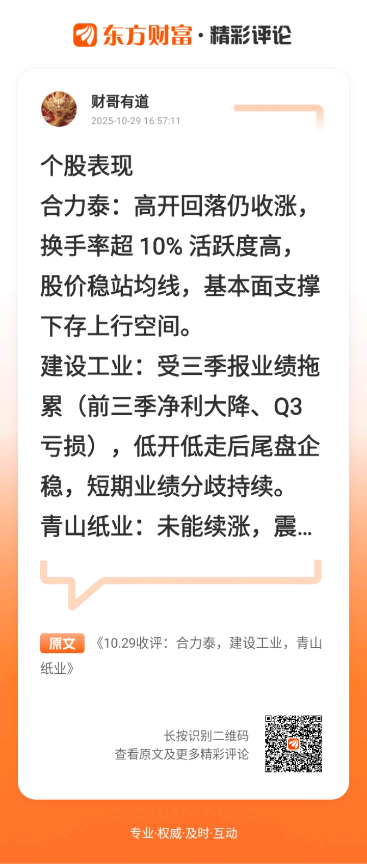 //@财哥有道 :个股表现$合力泰(SZ002217)$:高开回落仍收涨,换手率超 10% 活跃度高,股价稳站均线,基本面支撑下存上行空间。$建设工业(SZ002265)$:受三季报业绩拖累(前三季净利大降、Q3 亏损),低开低走后尾盘企稳,短期业绩分歧持续。$青山纸业(SH600103)$:未能续涨,震荡下探至 3.65 元,前期多头趋势未破,回调或为强势休整。指数与盘面:指数:高开稳步攀升,站稳 4000 点并转化为支撑,量能增超千亿,做多共识凝聚,后续有望延续上行。板块:有色金属(铜、锌领涨,大中矿业涨停)、光伏储能(阿特斯、隆基绿能涨停)、海南自贸区(海南发展等涨停)强势;证券、游戏、量子科技轮动;银行、部分福建本地股小幅调整,无碍整体向好。持仓复盘:赛力斯:震荡上行,短期调整尾声,股价站均线上,看好后续空间。卧龙电驱:低开修复,承接强、筹码集中,新能源 + 机器人属性支撑趋势,续持。凯美特气:低开高走修复,多头占优显题材韧性,续持。万向钱潮:震荡上行红盘报收,承接稳健,续持看多。核心结论:今日市场情绪向好,指数与量能共振,板块轮动清晰(工业金属、光伏为主线),个股分化但优质标的韧性凸显,后续需关注主线板块持续性与量能维系情况。