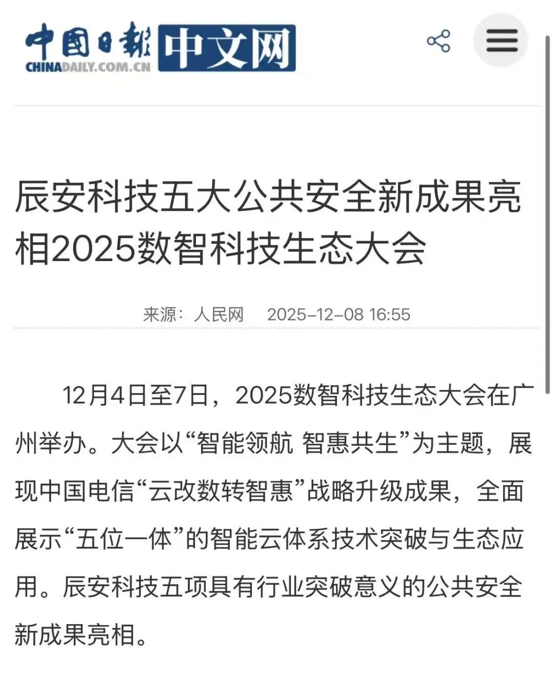 近日,人民网、中国日报网、环球网等媒体对辰安科技在数智科技生态大会上发布的五大公