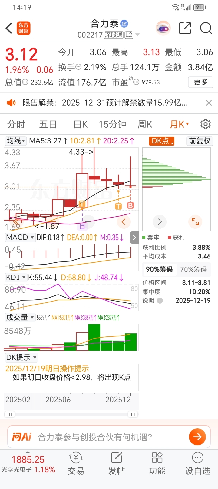 $合力泰(SZ002217)$ 月线来看,货已出完,快要自由落体下跌了