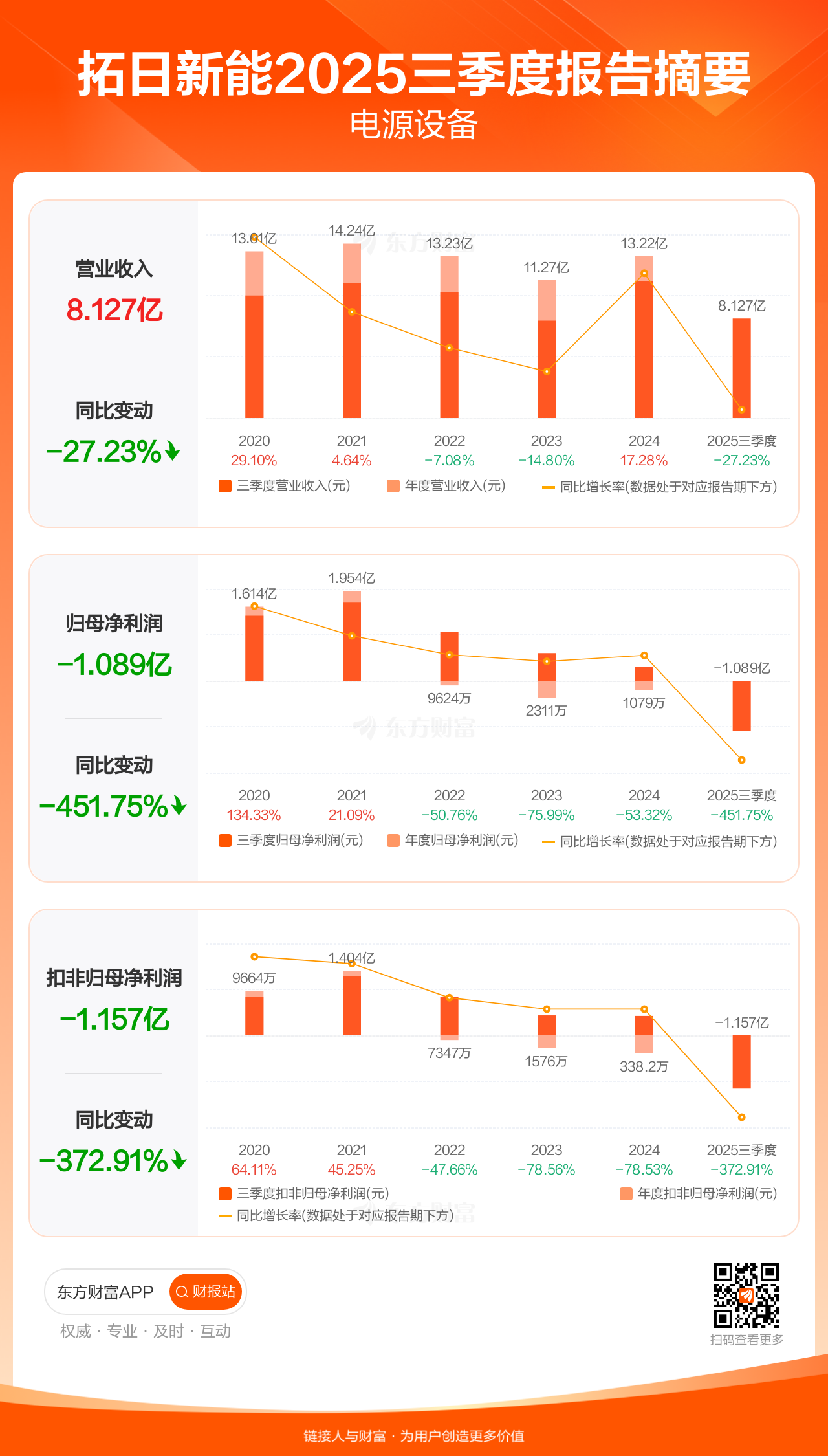 拓日新能10月29日发布2025年三季报显示,公司前三季实现营业收入8.13亿元,同比下滑27.23%;归母净利润-1.09亿元;扣非归母净利润-1.16亿元。