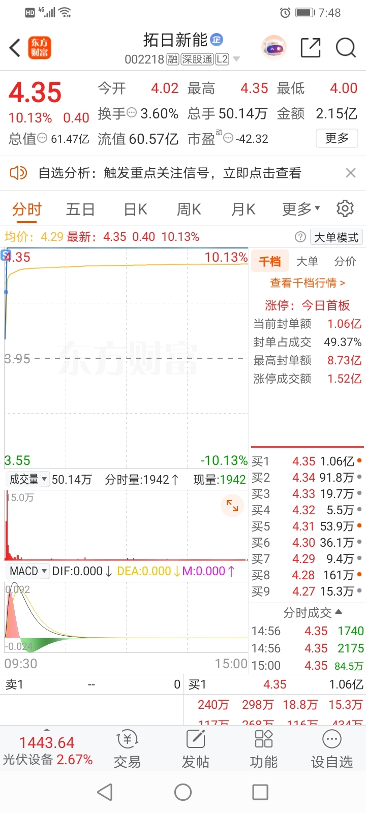 $拓日新能(SZ002218)$ 昨天还是拉太慢了,以为又是高开低走,卖求了,还能买回来吗?