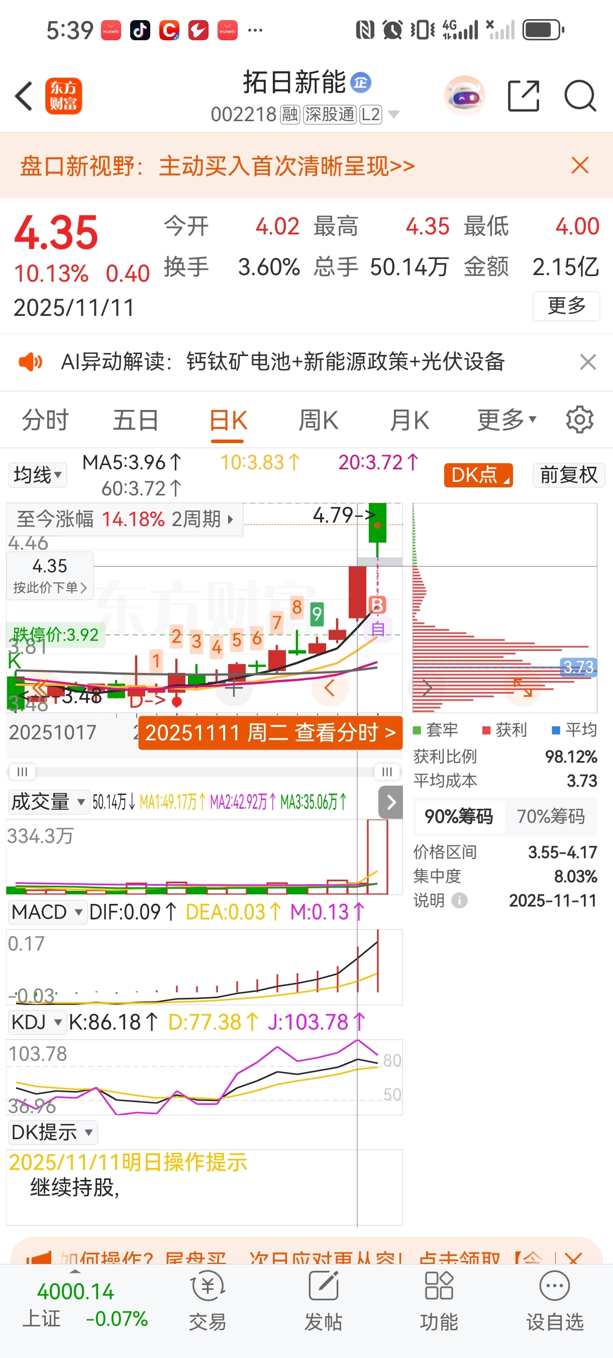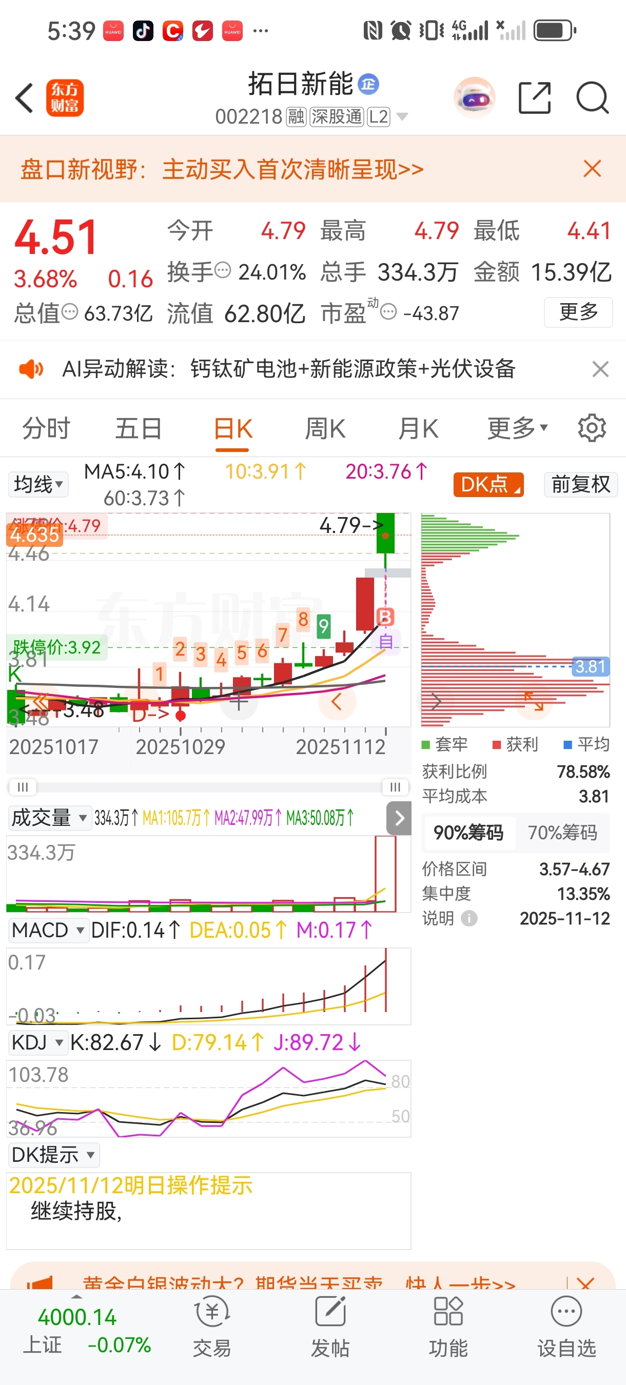 $拓日新能(SZ002218)$ 今天应该是解套前期的套牢盘,筹码峰基本没动,拿好了,明天准备返攻……