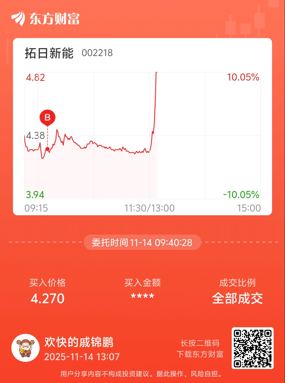 $拓日新能(SZ002218)$ 早上梭哈,下午涨停,是好票