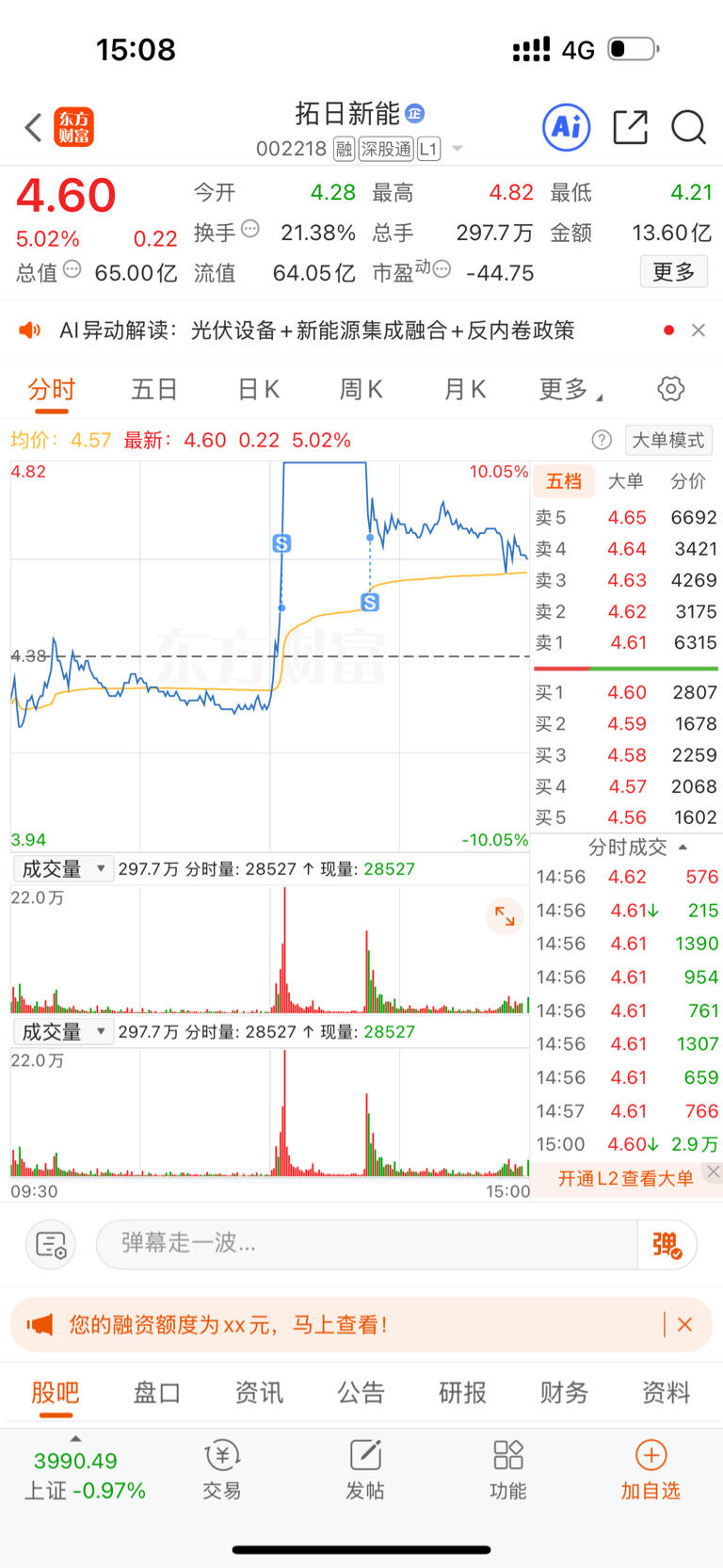$拓日新能(SZ002218)$ 昨天买的 今天就一日游吧