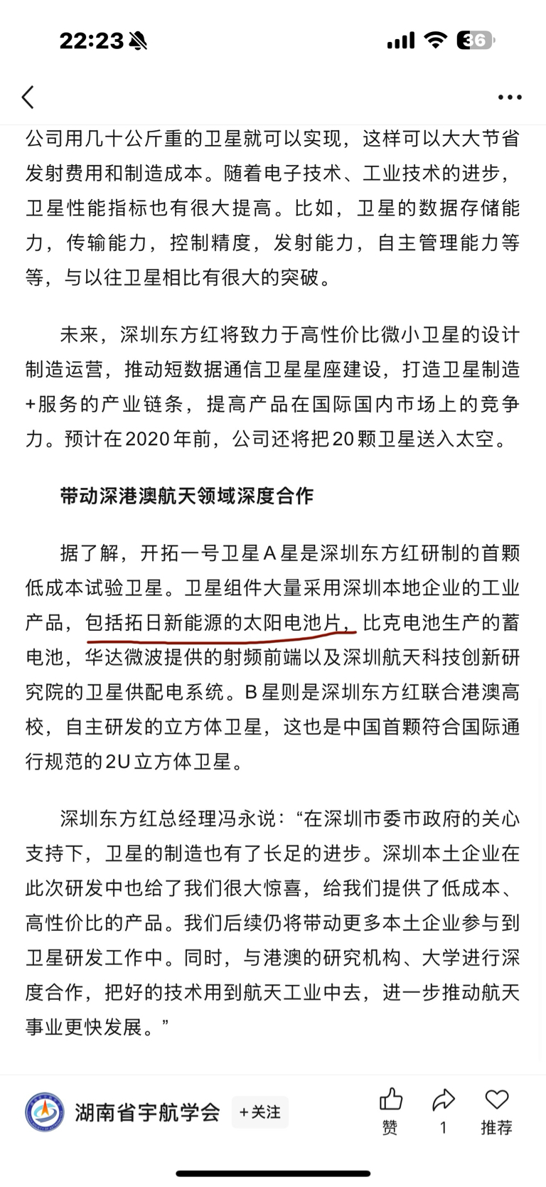 2015年参与东方红卫星“开拓一号”单晶硅太阳电池项目,产品在轨运行稳定;并参与