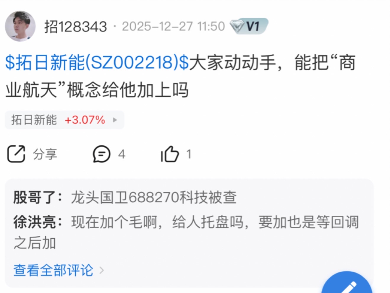 $拓日新能(SZ002218)$ 一个星前就说让维护,很多韭菜不懂,说商业航天到头了。这些人根本不懂一个大题材是怎么炒作的