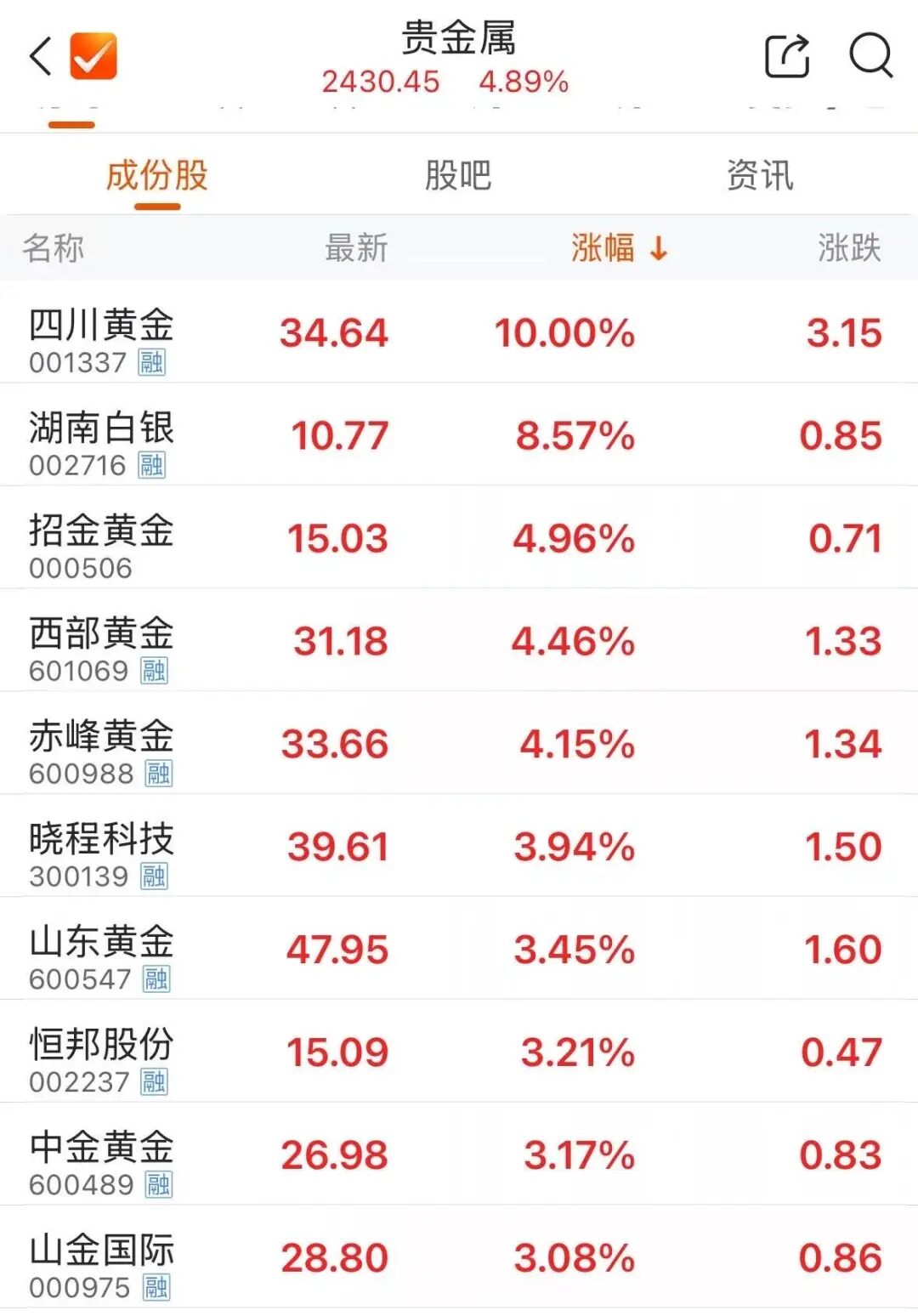 贵金属板块走强,四川黄金涨停,湖南白银、西部黄金等跟涨。