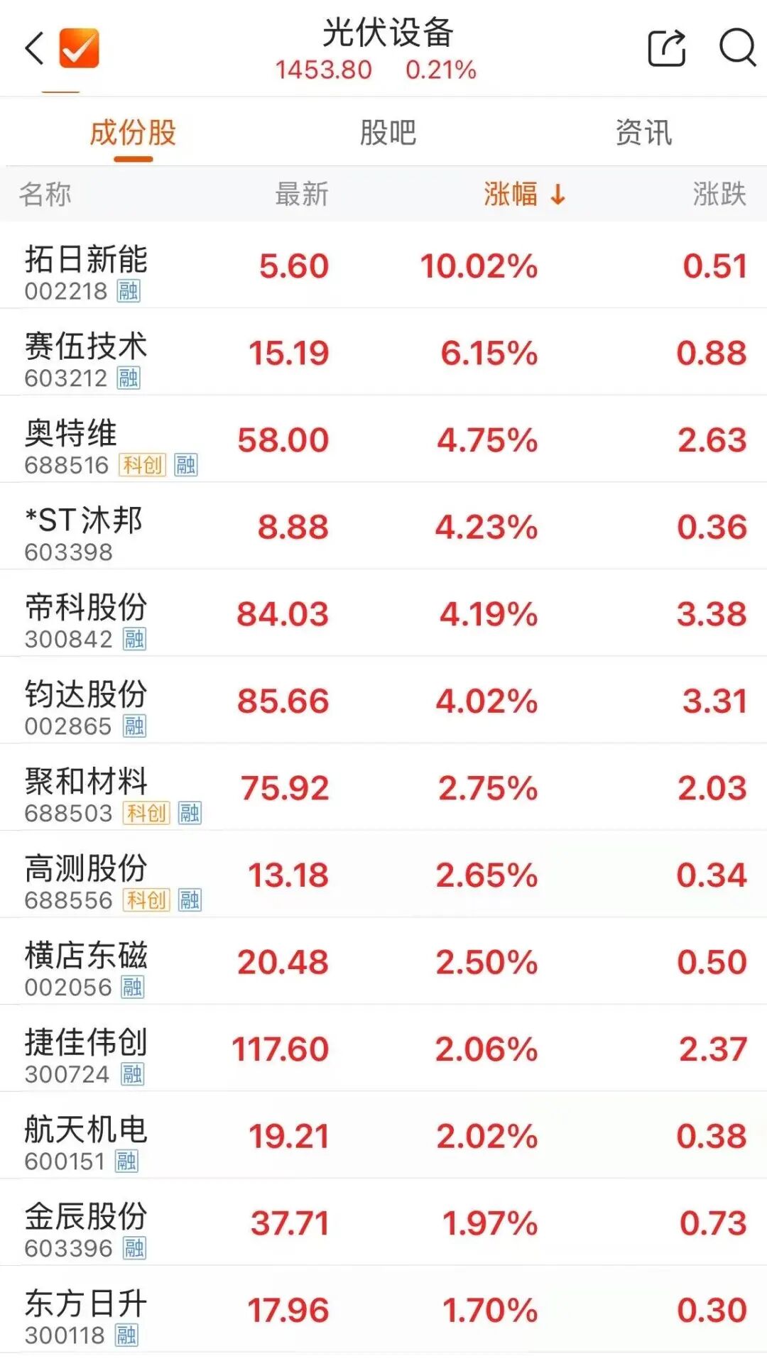 光伏设备板块异动,拓日新能2连板,赛伍技术涨超6%,盘中一度触及涨停。帝科股份、钧达股份、东方日升、双良节能等跟涨。