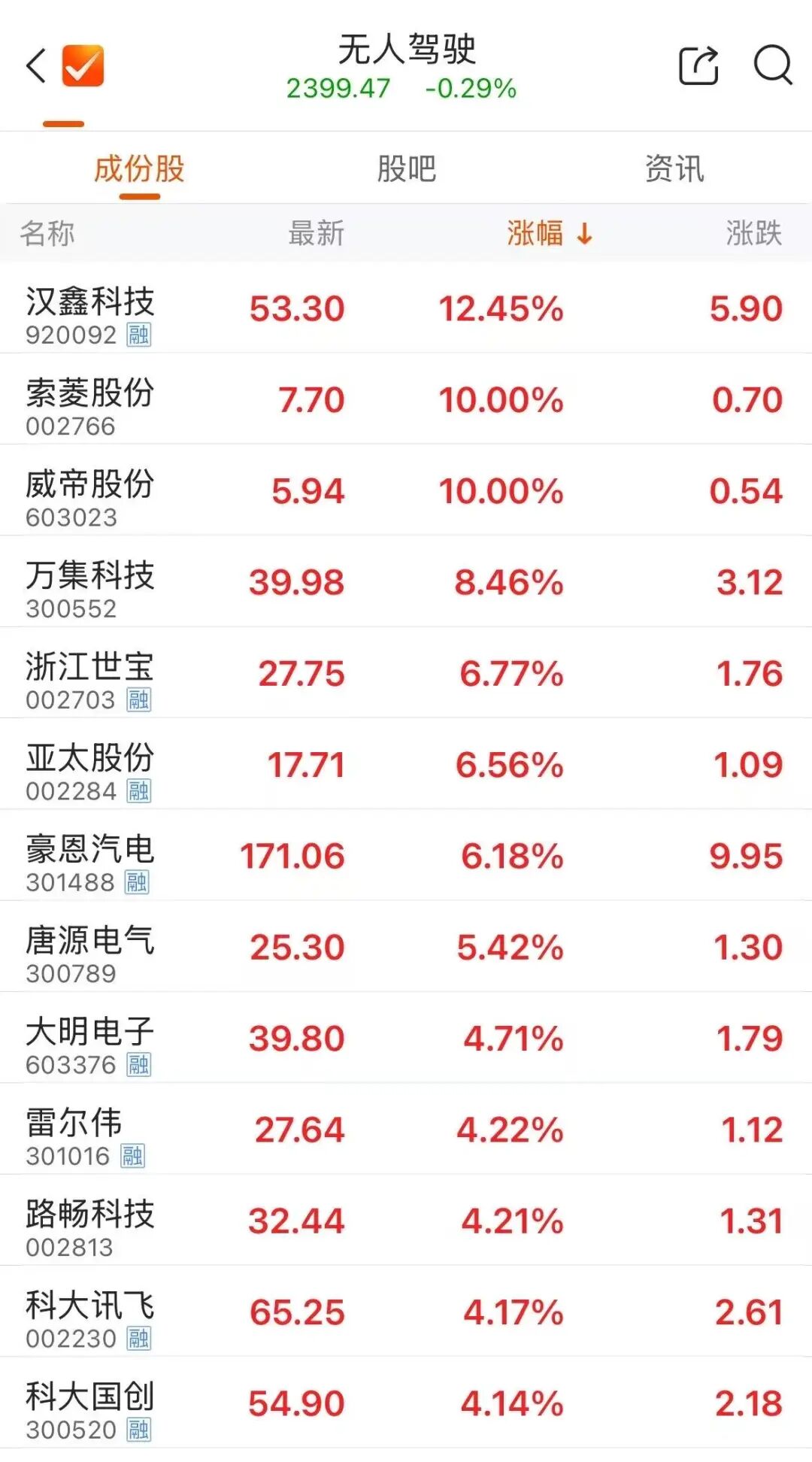 无人驾驶概念拉升,索菱股份、威帝股份涨停,万集科技、浙江世宝等冲高。