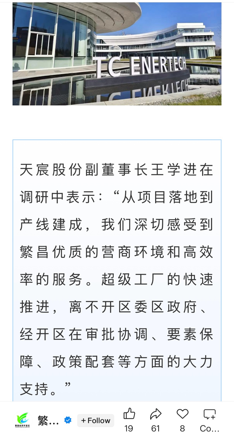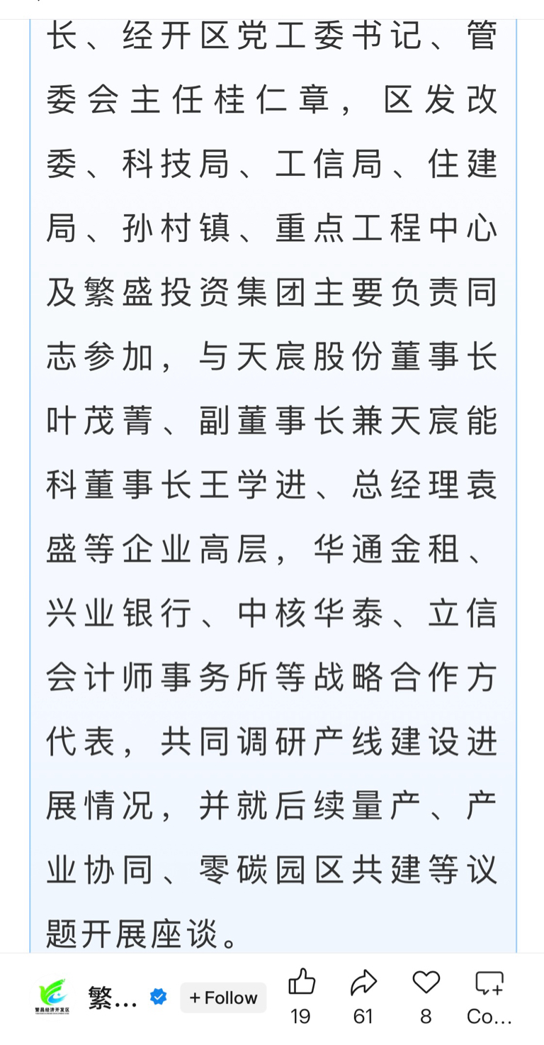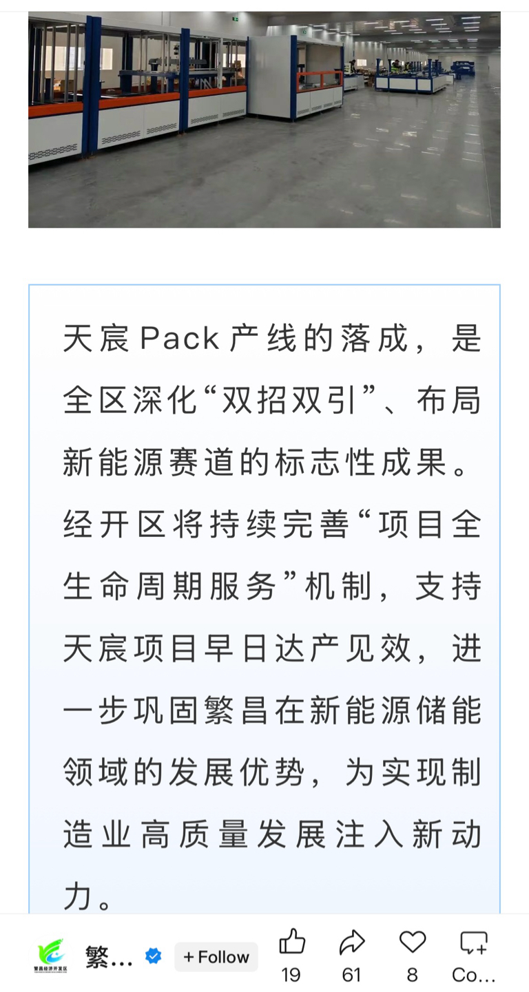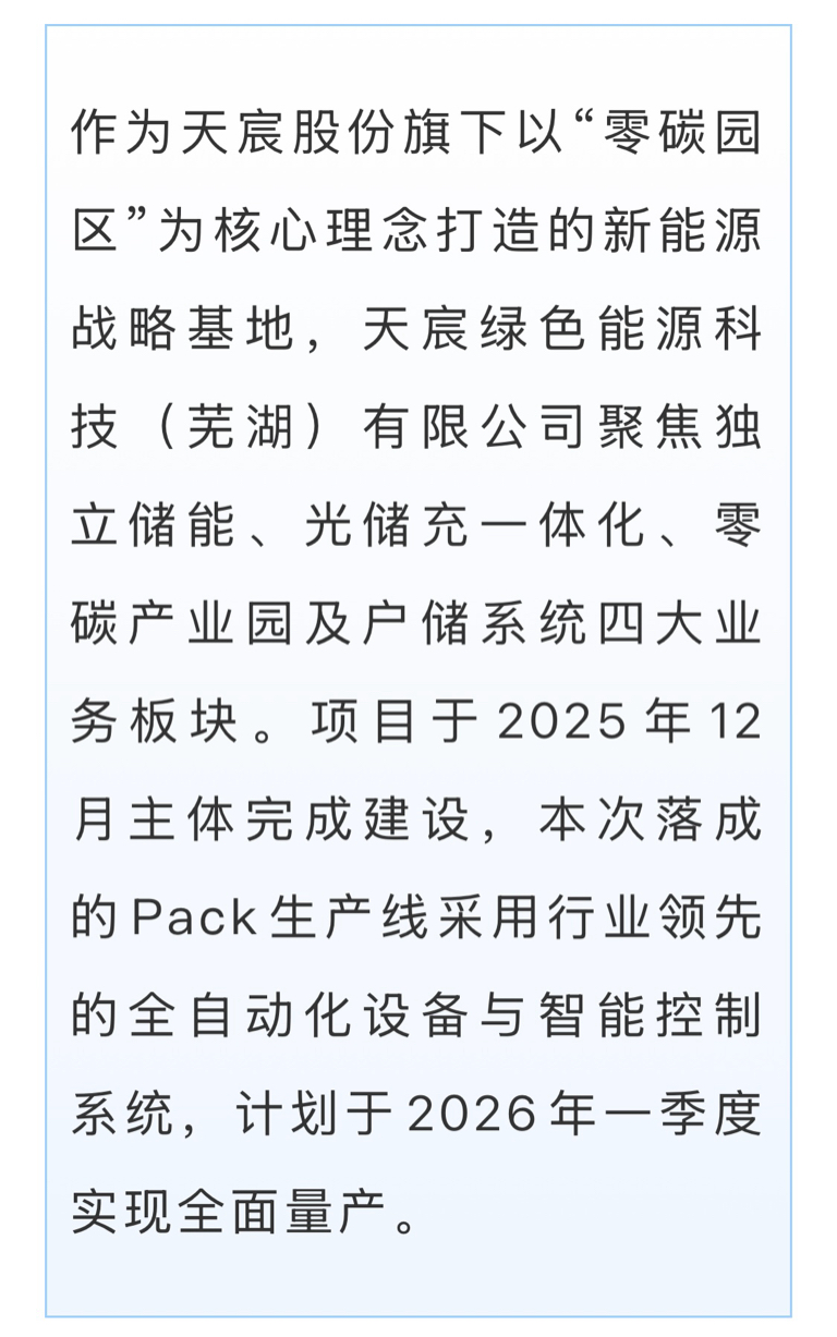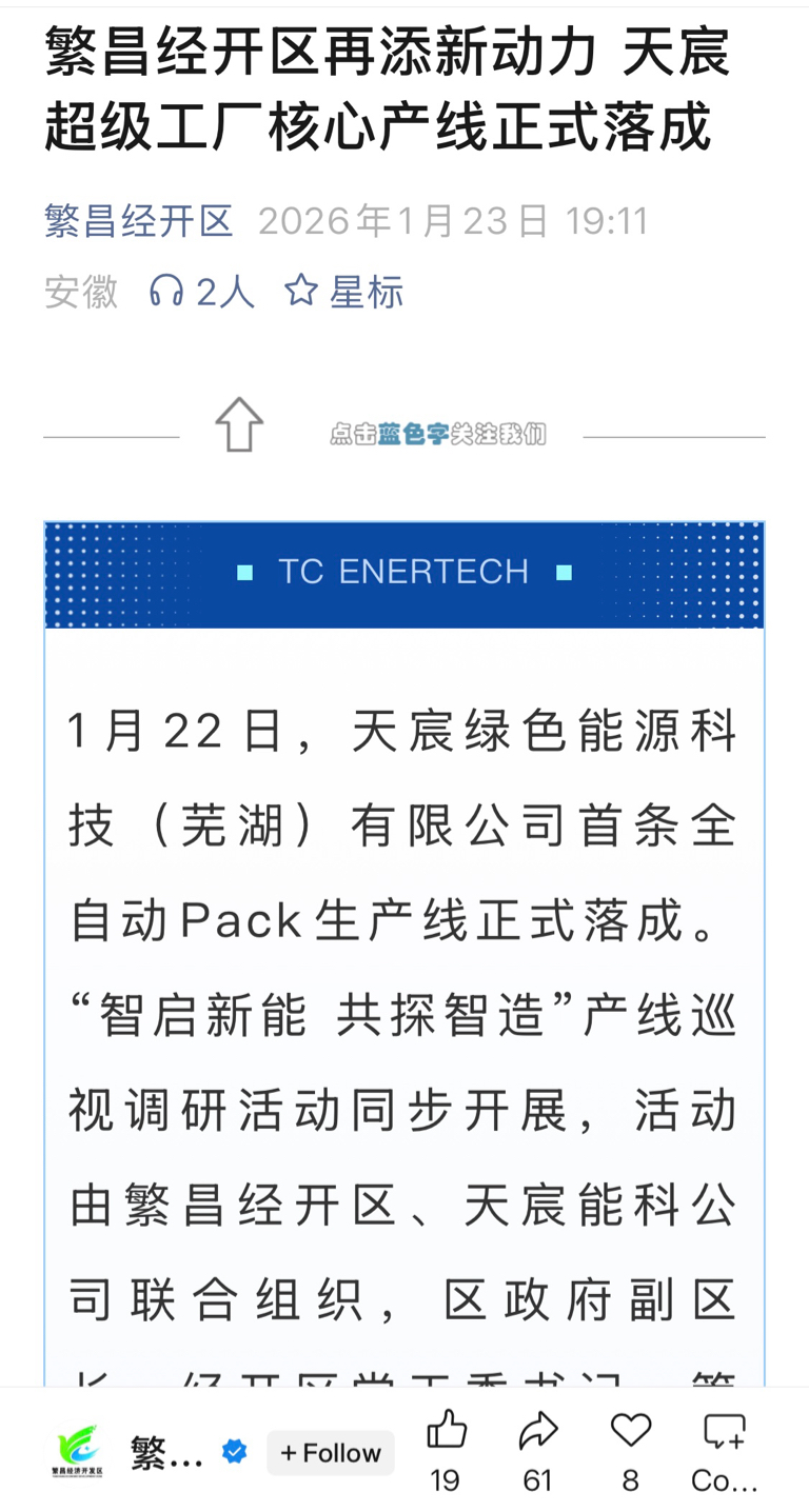 1月22日,天宸绿色能源科技(芜湖)有限公司首条全自动Pack生产线正式落成。“智启新能 共探智造”产线巡视调研活动同步开展,活动由繁昌经开区、天宸能科公司联合组织,区政府副区长、经开区党工委书记、管委会主任桂仁章,区发改委、科技局、工信局、住建局、孙村镇、重点工程中心及繁盛投资集团主要负责同志参加,与天宸股份董事长叶茂菁、副董事长兼天宸能科董事长王学进、总经理袁盛等企业高层,华通金租、兴业银行、中核华泰、立信会计师事务所等战略合作方代表,共同调研产线建设进展情况,并就后续量产、产业协同、零碳园区共建等议题开展座谈。