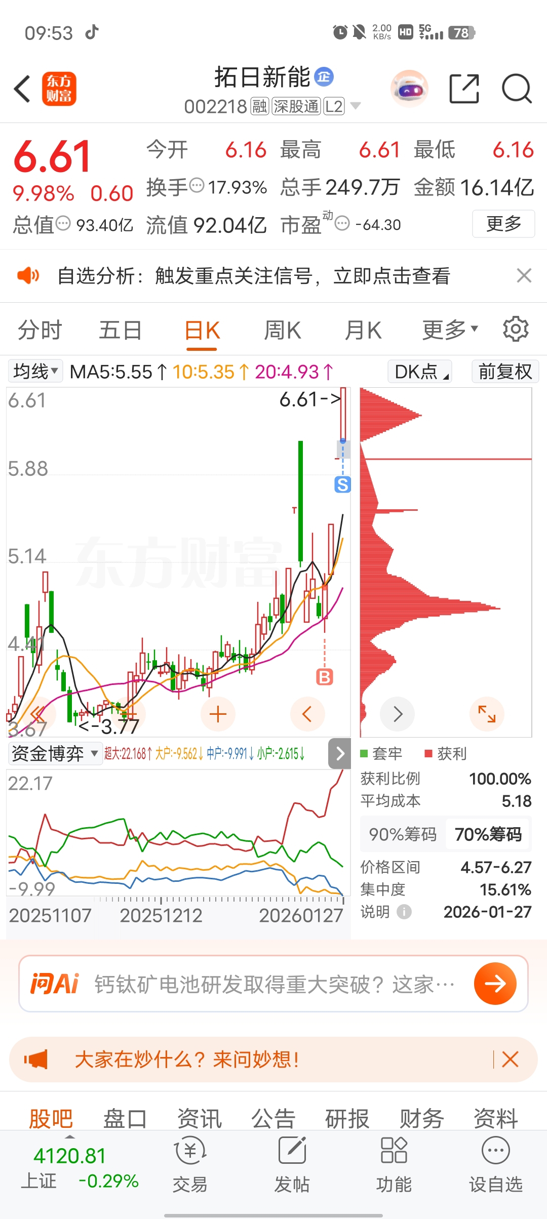 $拓日新能(SZ002218)$ 昨天想会开板就加仓,结果还是看行情太差直接跑了,留100股纪念下吧