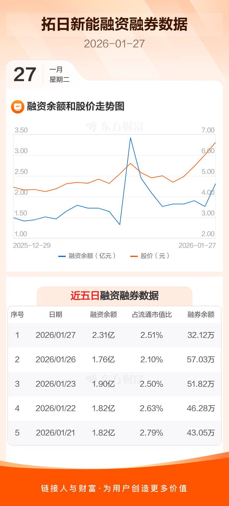 交易所最新数据显示,拓日新能于2026年1月27日获融资买入1.60亿元,融资偿还1.04亿元,当日融资净买入5506.63万元。目前,该股融资余额2.31亿,占流通市值比例为2.51%。