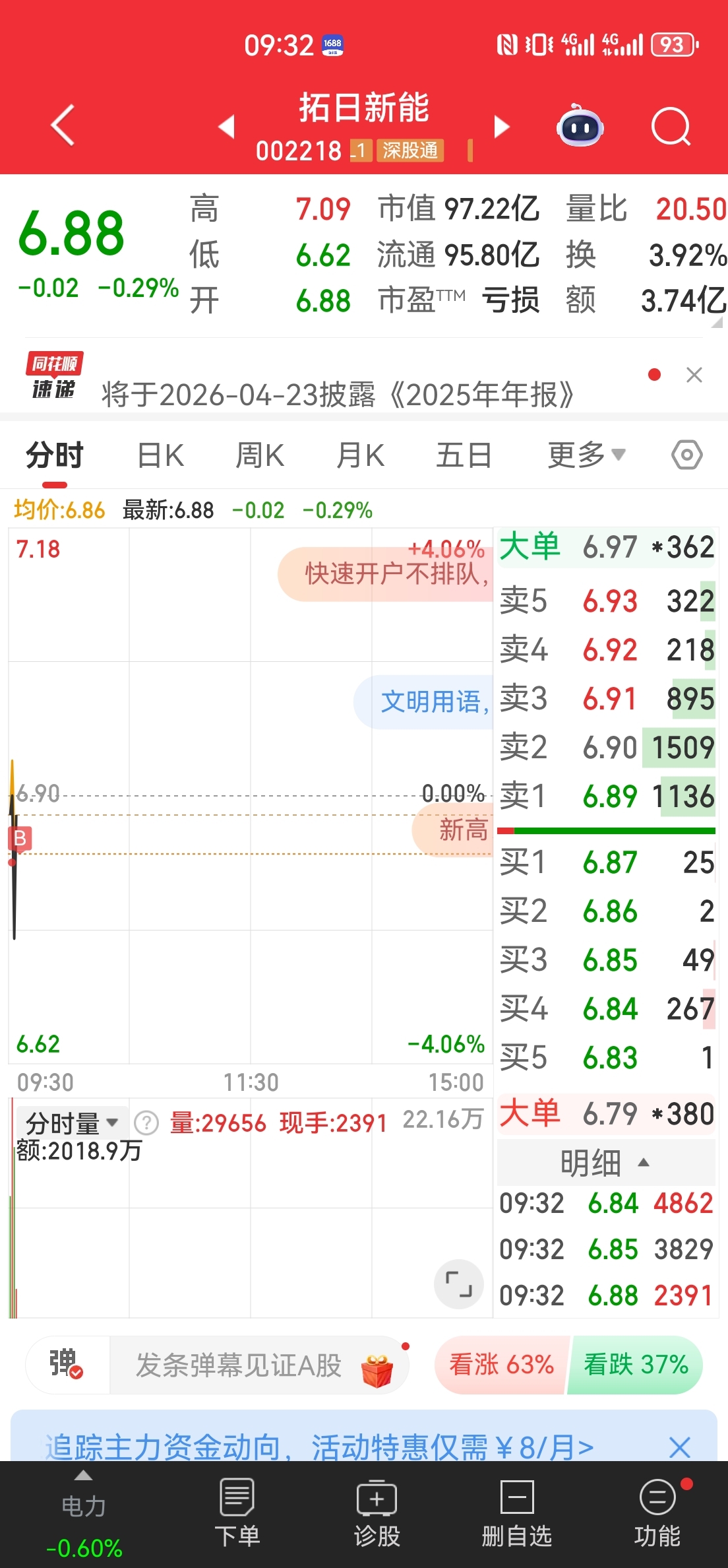 $拓日新能(SZ002218)$ 一万到一百万第71天,三维水上走了,-1买了拓日