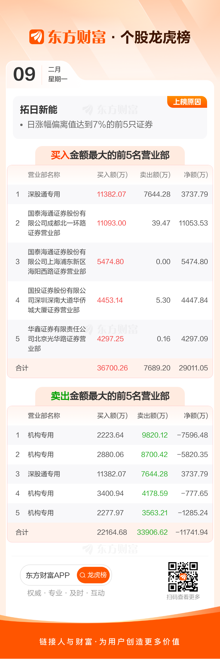 交易所2026年2月9日公布的交易公开信息显示,拓日新能因成为日涨幅偏离值达到7%的前5只证券上榜。拓日新能当日收报7.96元,涨跌幅9.94%,偏离值8.09%,换手率30.87%,成交额33.47亿。