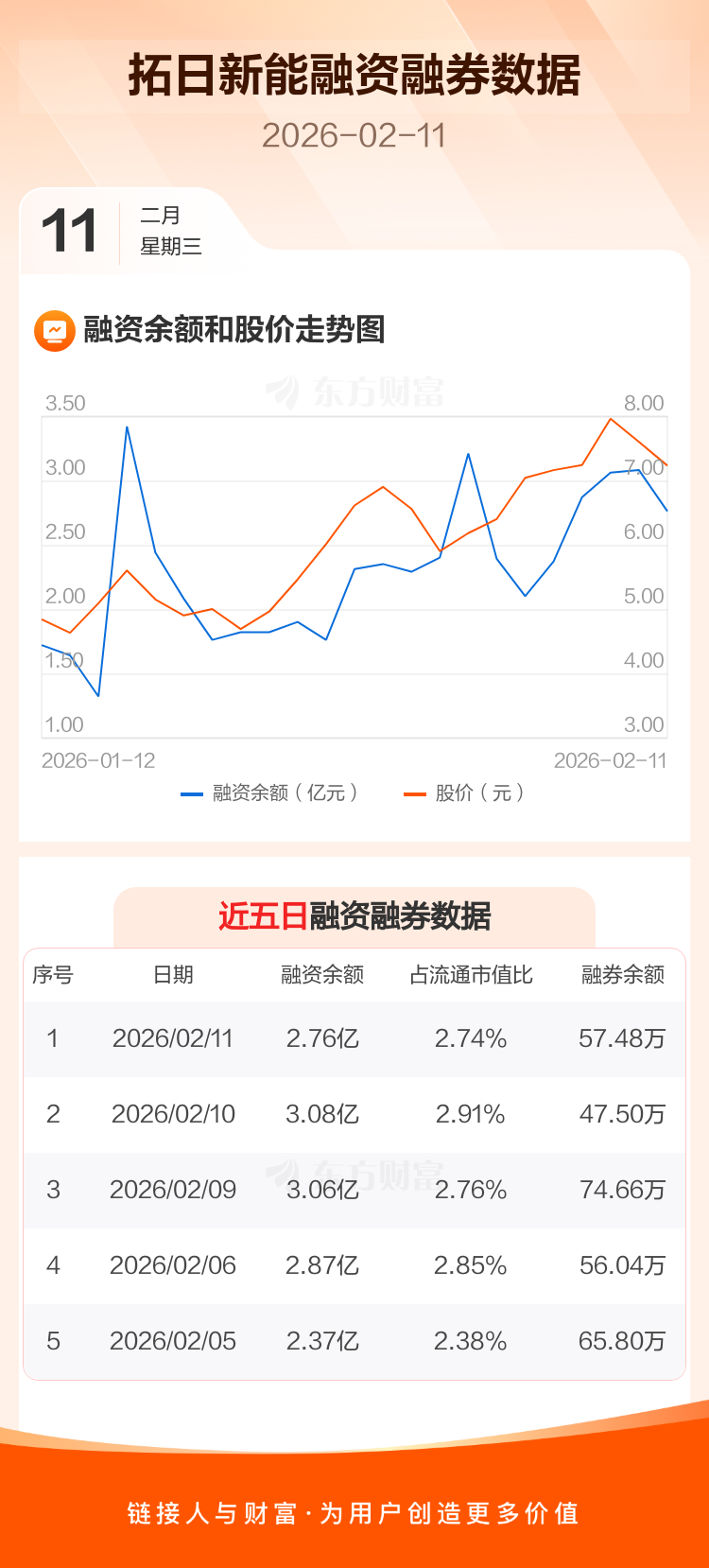 交易所最新数据显示,拓日新能于2026年2月11日获融资买入1.10亿元,融资偿还1.41亿元,当日融资净偿还3181.74万元。目前,该股融资余额2.76亿,占流通市值比例为2.74%。