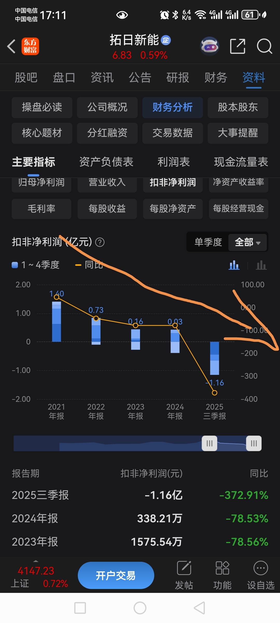$拓日新能(SZ002218)$ 你看这份财务报表的“扣非净利润”趋势图,主要大资金在边震荡边出逃资金。何为“扣非净利润”?通俗讲就是一年不如一年!主业一年不如一年!