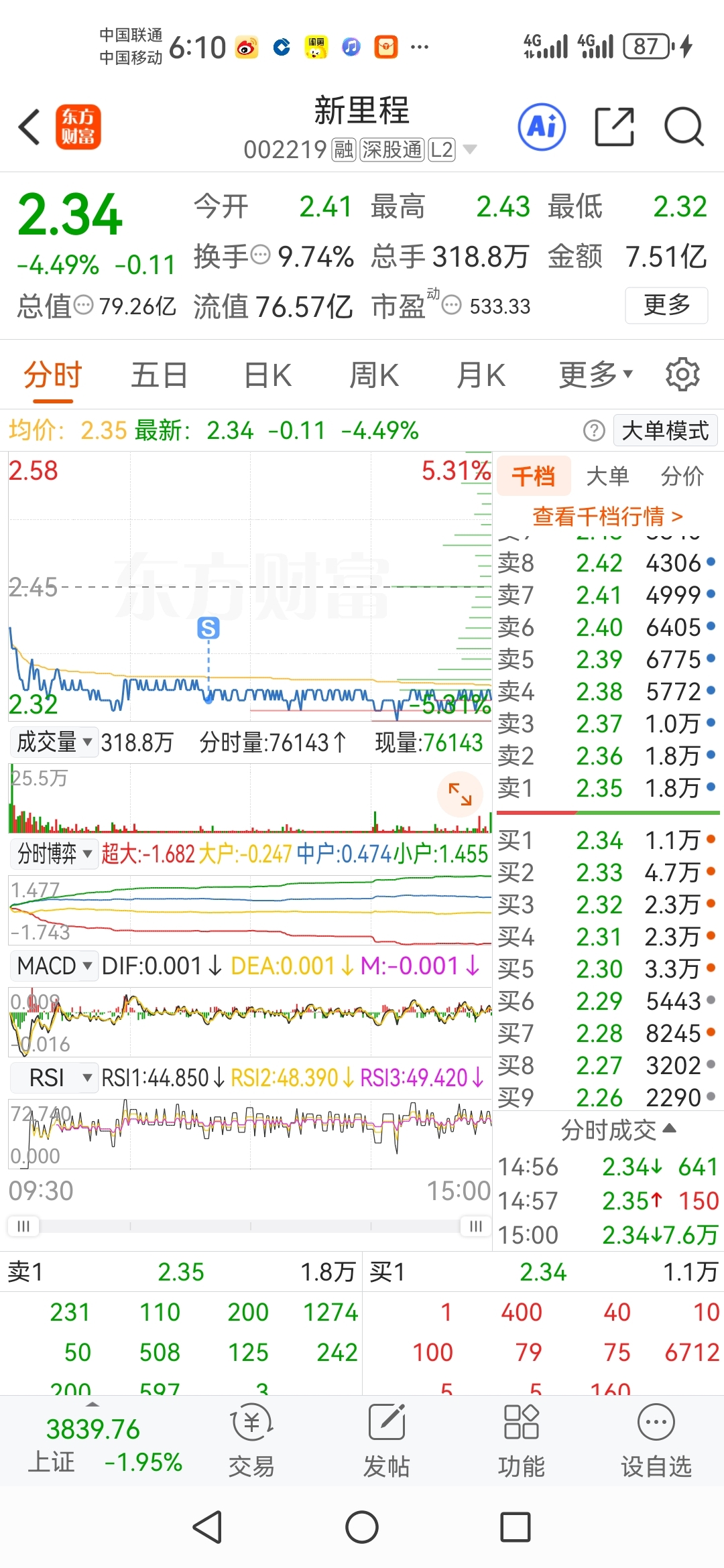 $新里程(SZ002219)$ 今天走了啊,周线没有收在2.35,之前是2.36,就差1分,主力偏偏不让你如愿,那只好借坡下驴吧