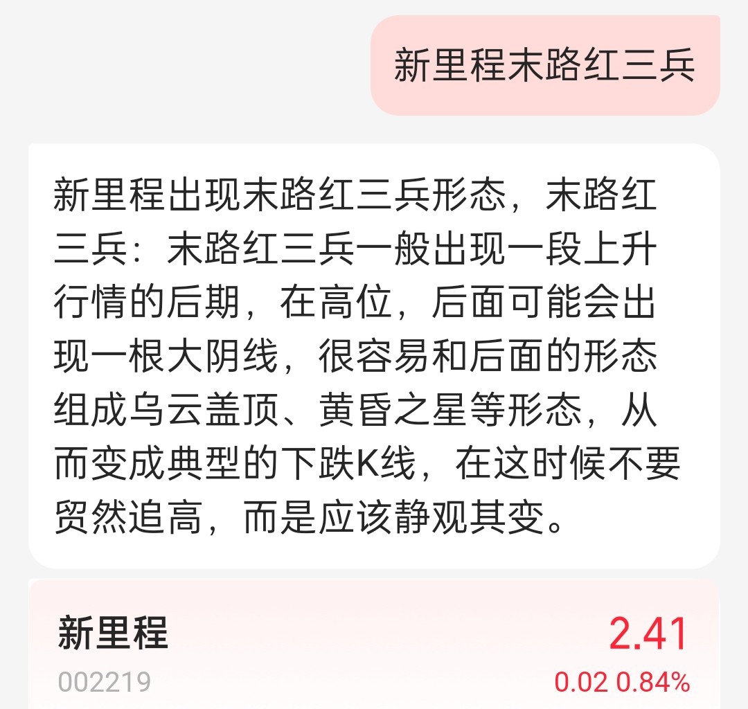 $新里程(SZ002219)$ 同花顺显示提醒新里程昨天出现末路红三兵形态!