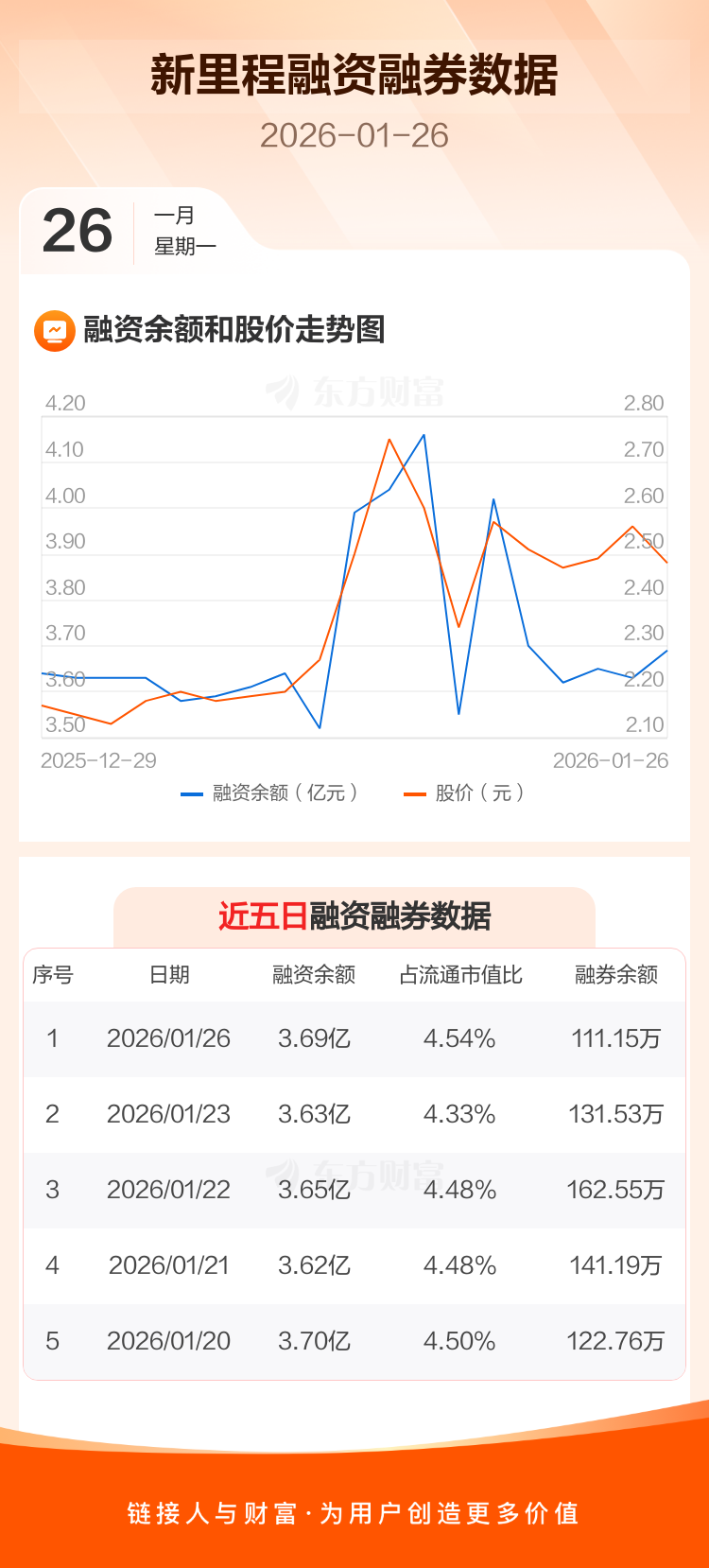 交易所最新数据显示,新里程于2026年1月26日获融资买入4256.61万元,融资偿还3645.64万元,当日融资净买入610.96万元。目前,该股融资余额3.69亿,占流通市值比例为4.54%。